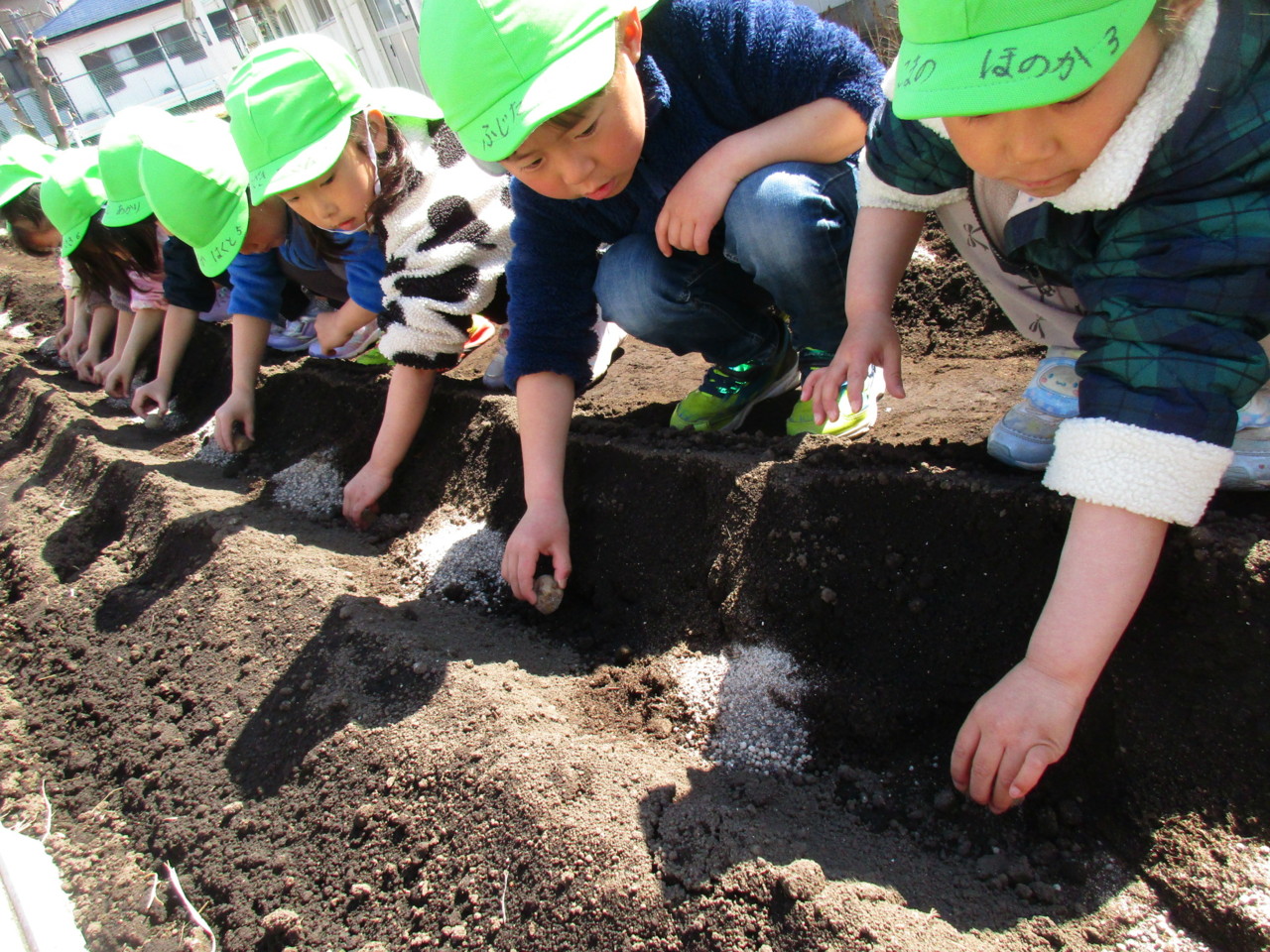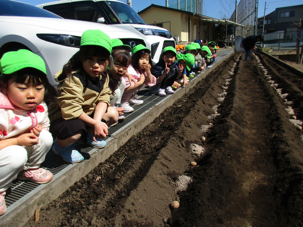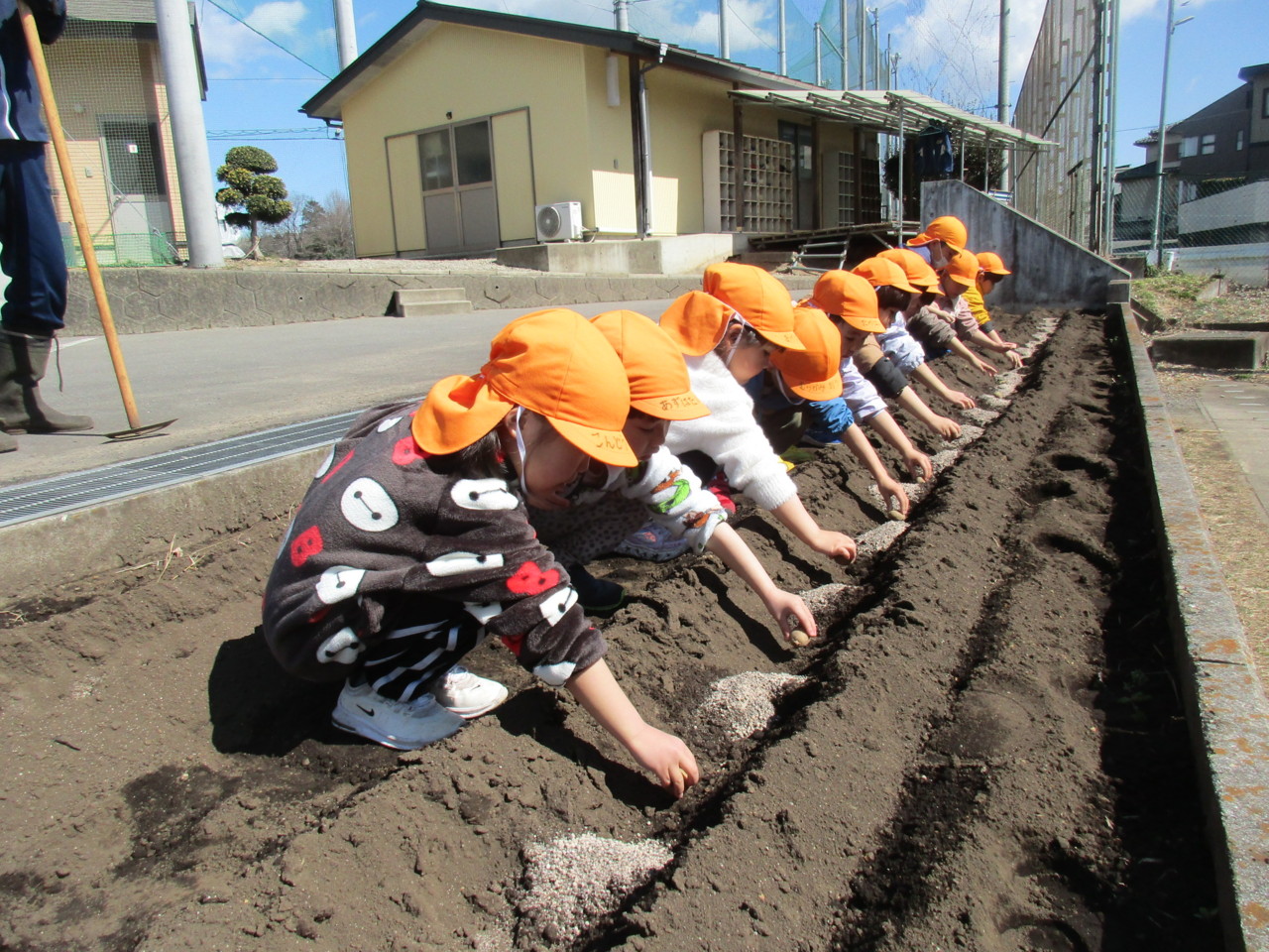 年中組が青空の下、じゃがいもを撒きました。