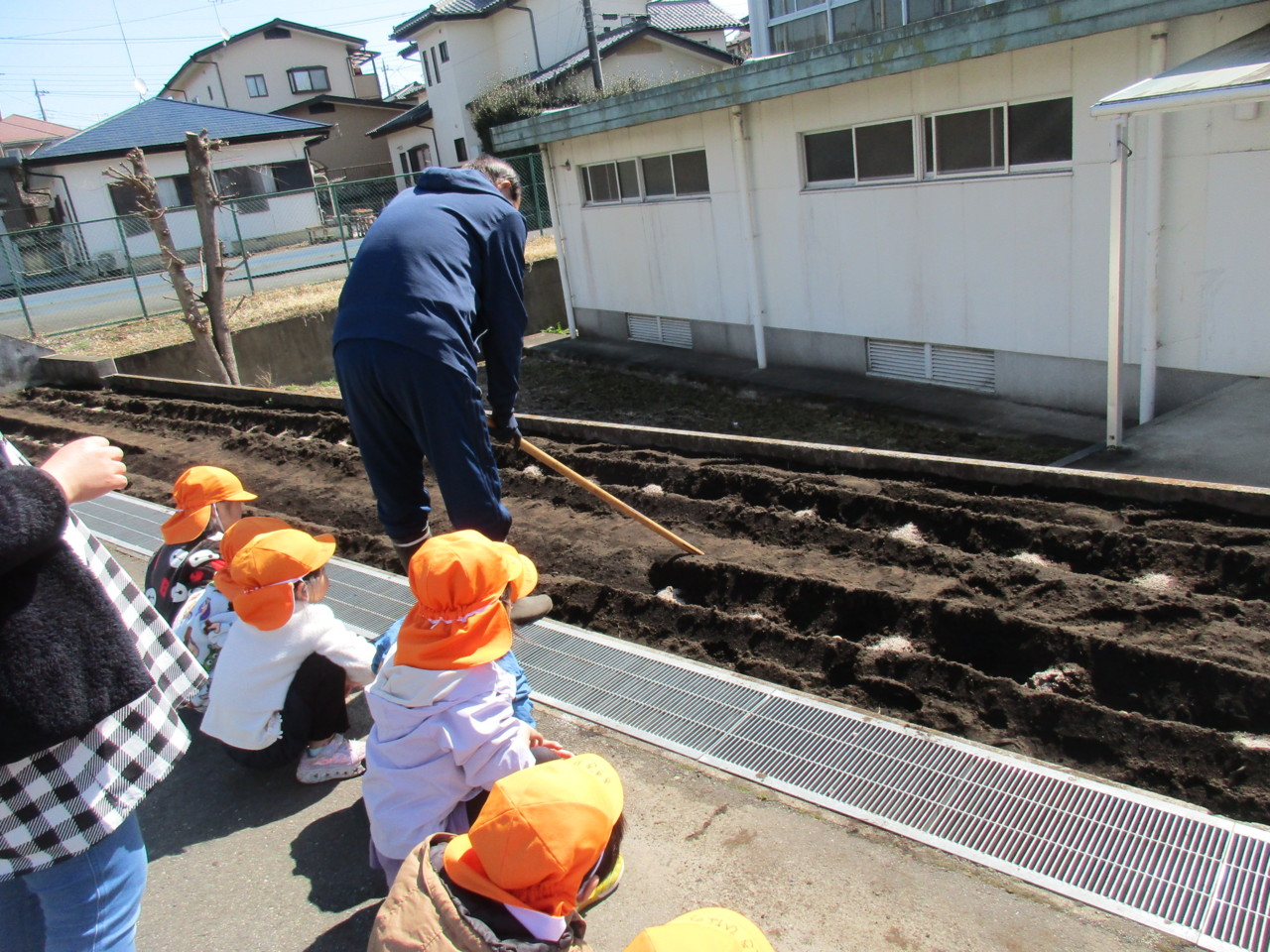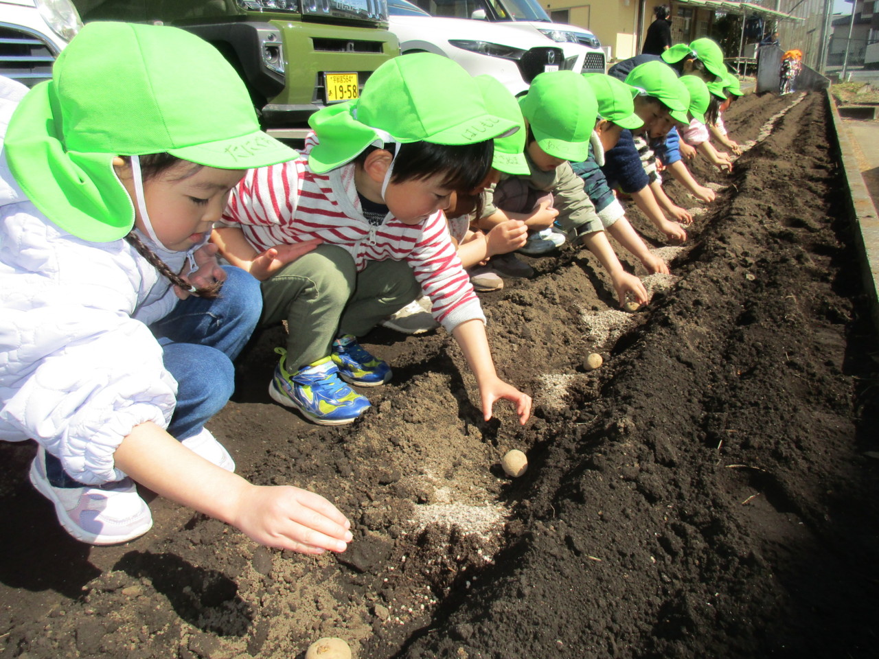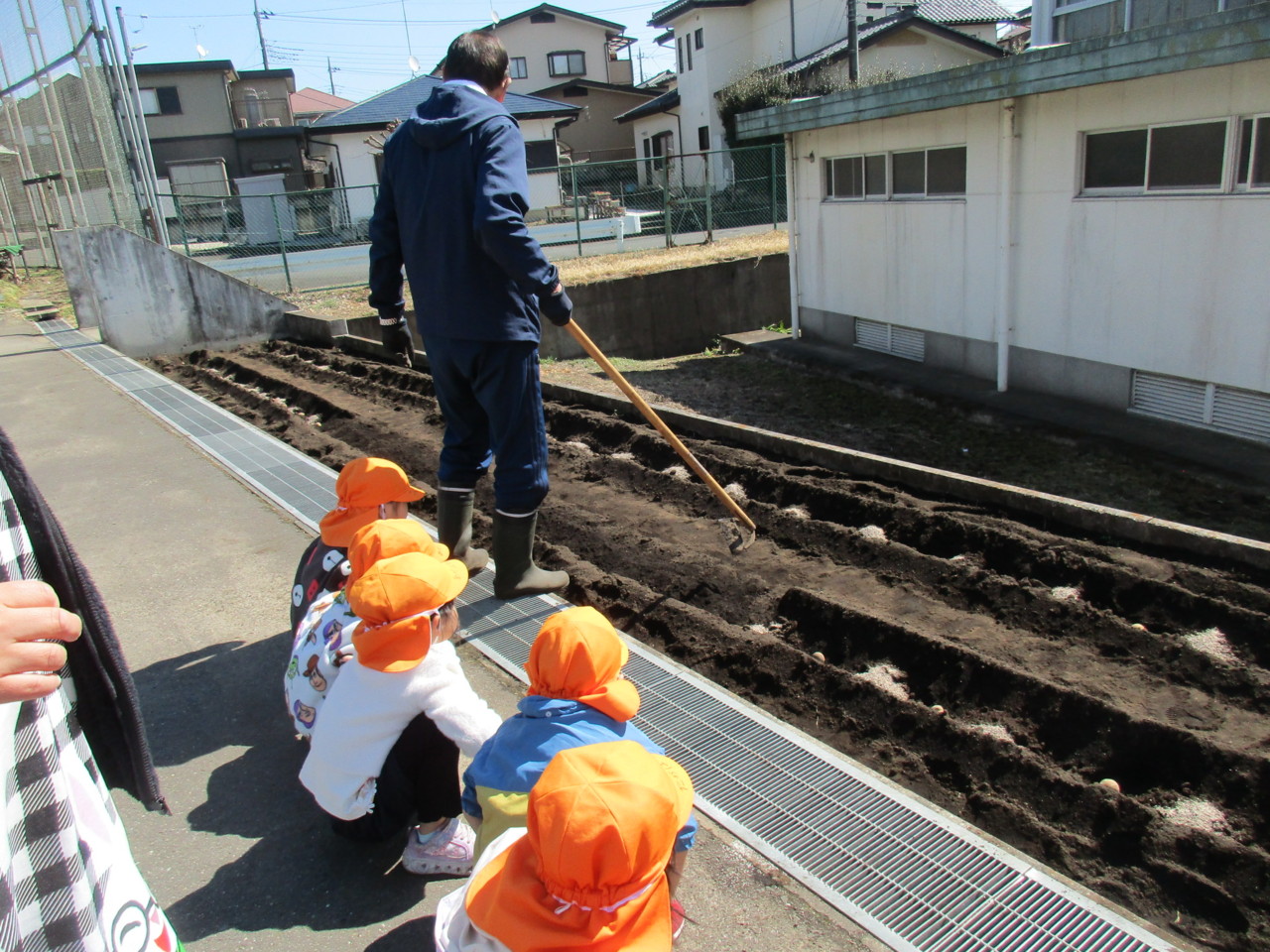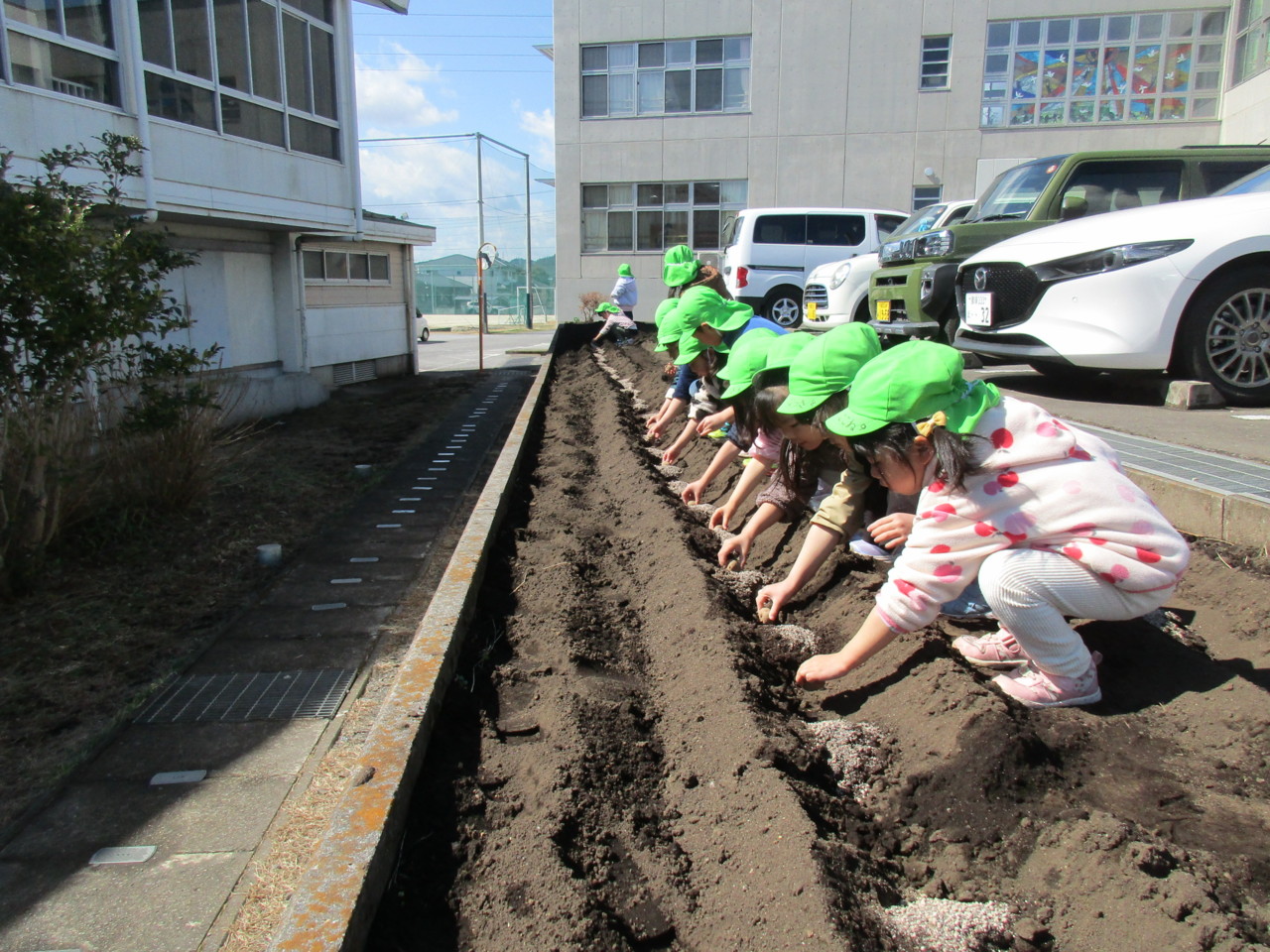 年中組が青空の下、じゃがいもを撒きました。