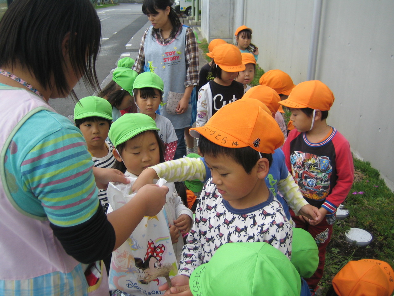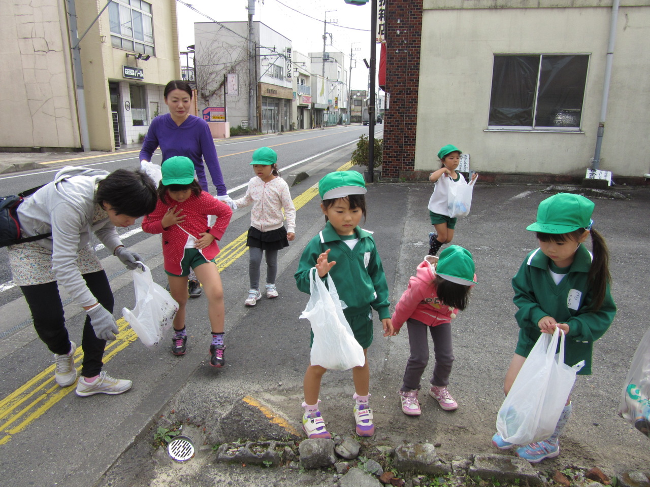 年中組は、園周辺を年少組、2歳児は園庭のゴミ拾いをしました。