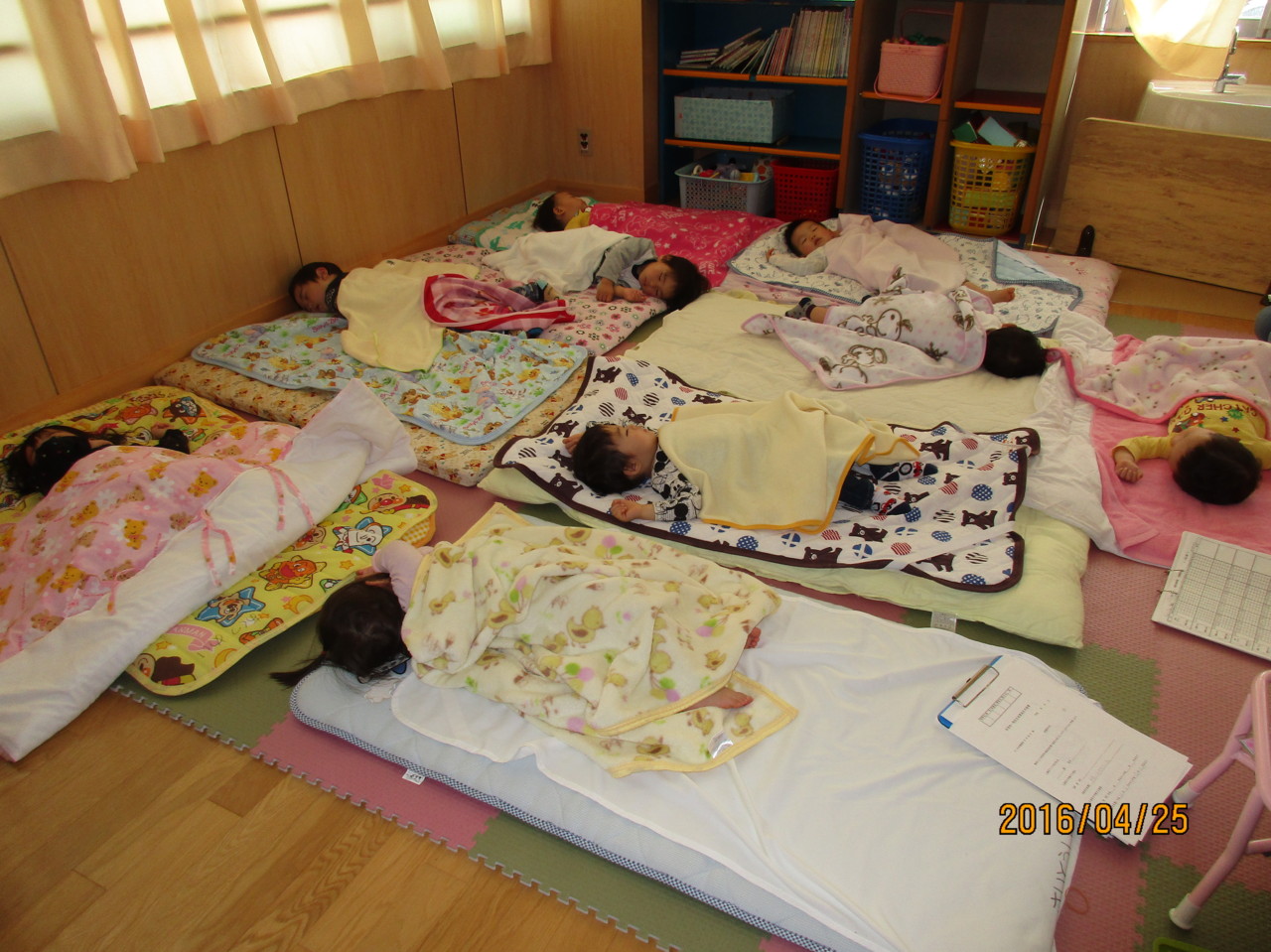 そのあとは、おやすみなさ~い。みんなでお昼寝です。