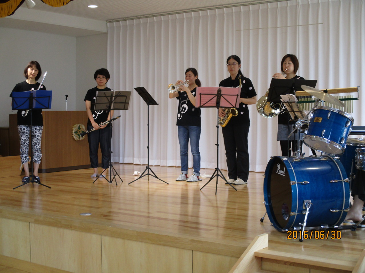 フルート・クラリネット・トランペット・サックス・ホルン・ドラム・パーカッション・ピアノの楽器で子ども達の知っている曲も演奏してくださいました。