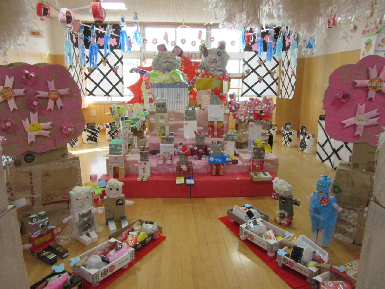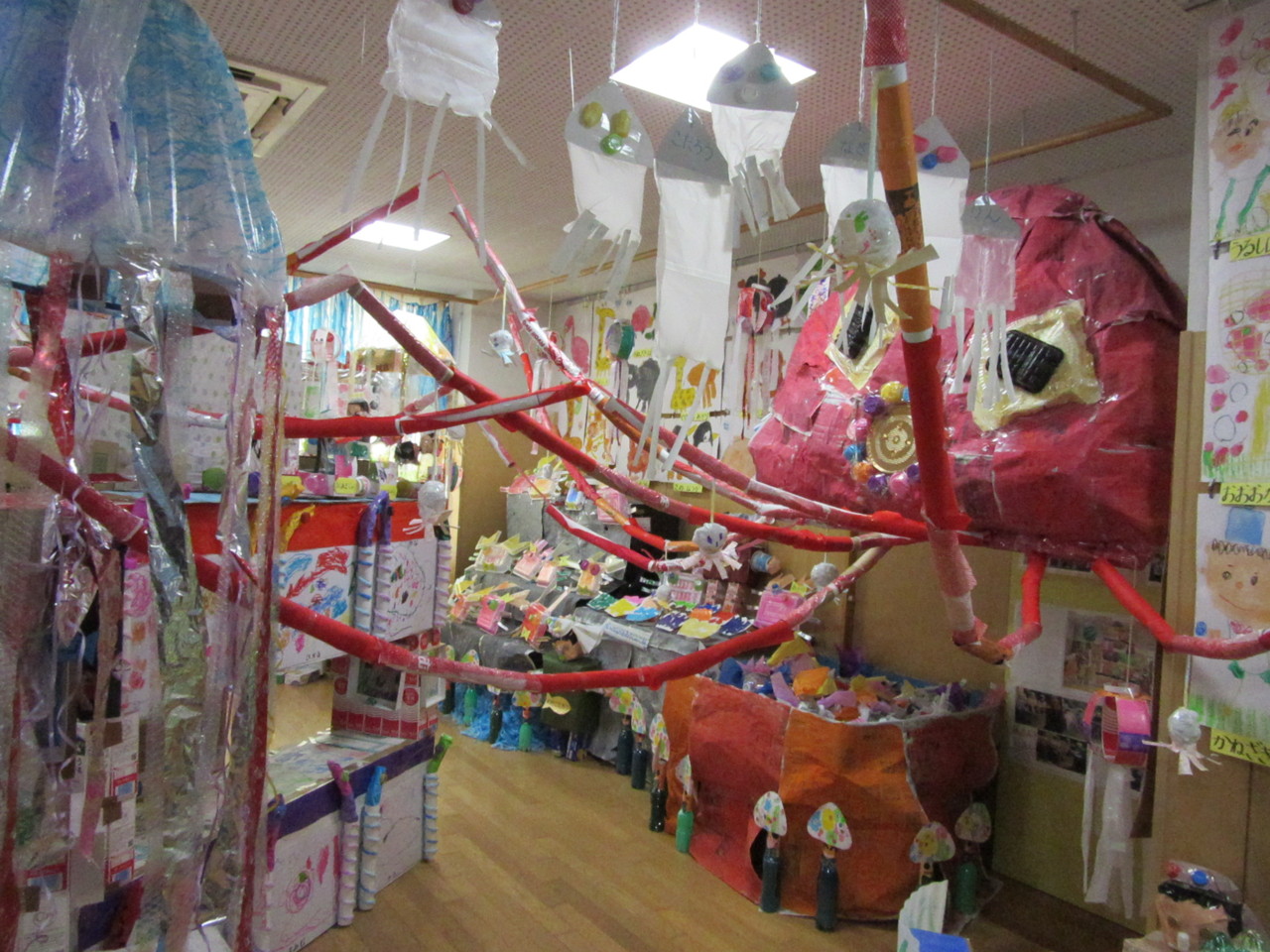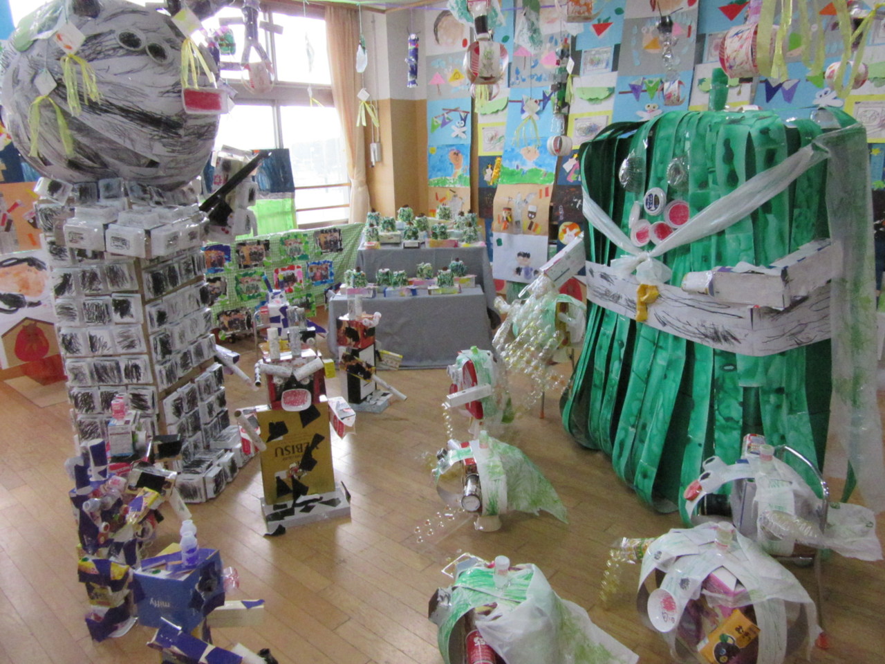 ご家庭からご協力いただいた廃品を使って子供たちの手によって素敵な作品がたくさん出来上がりました。