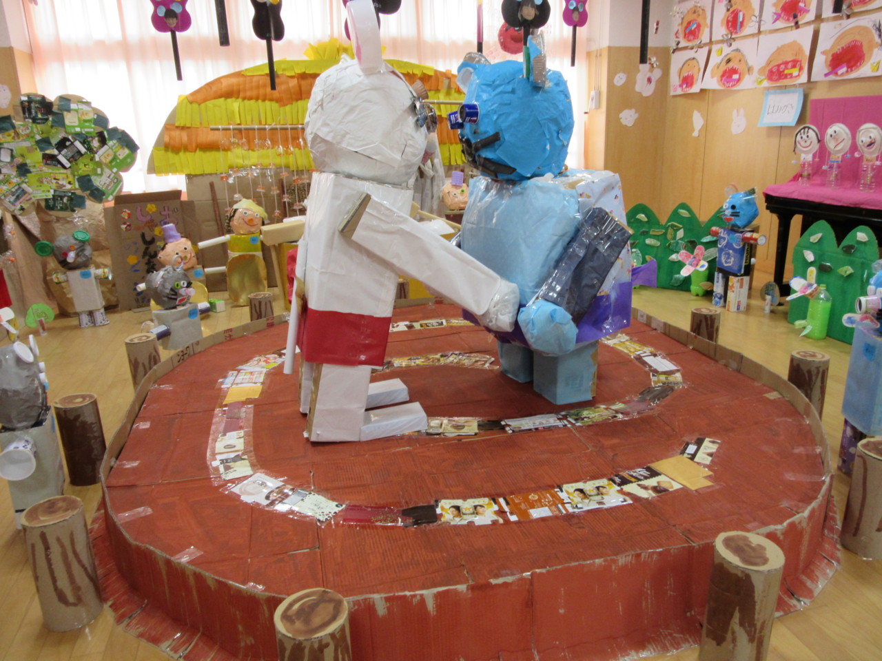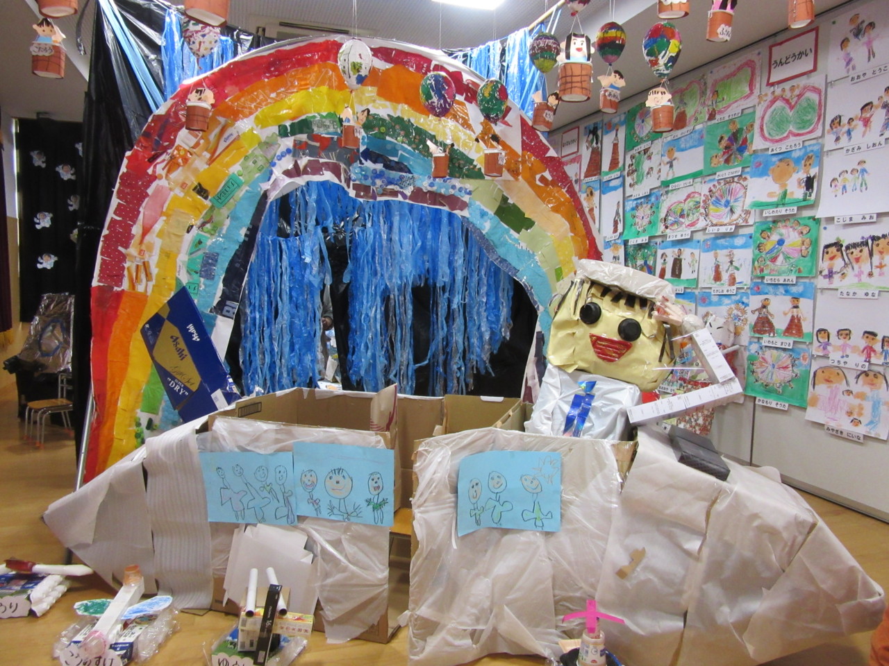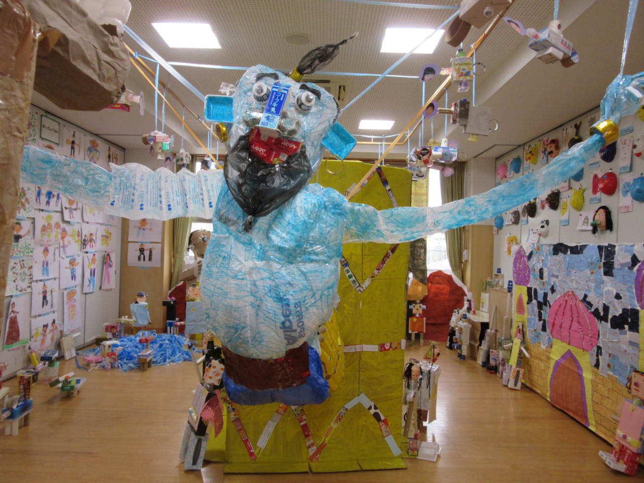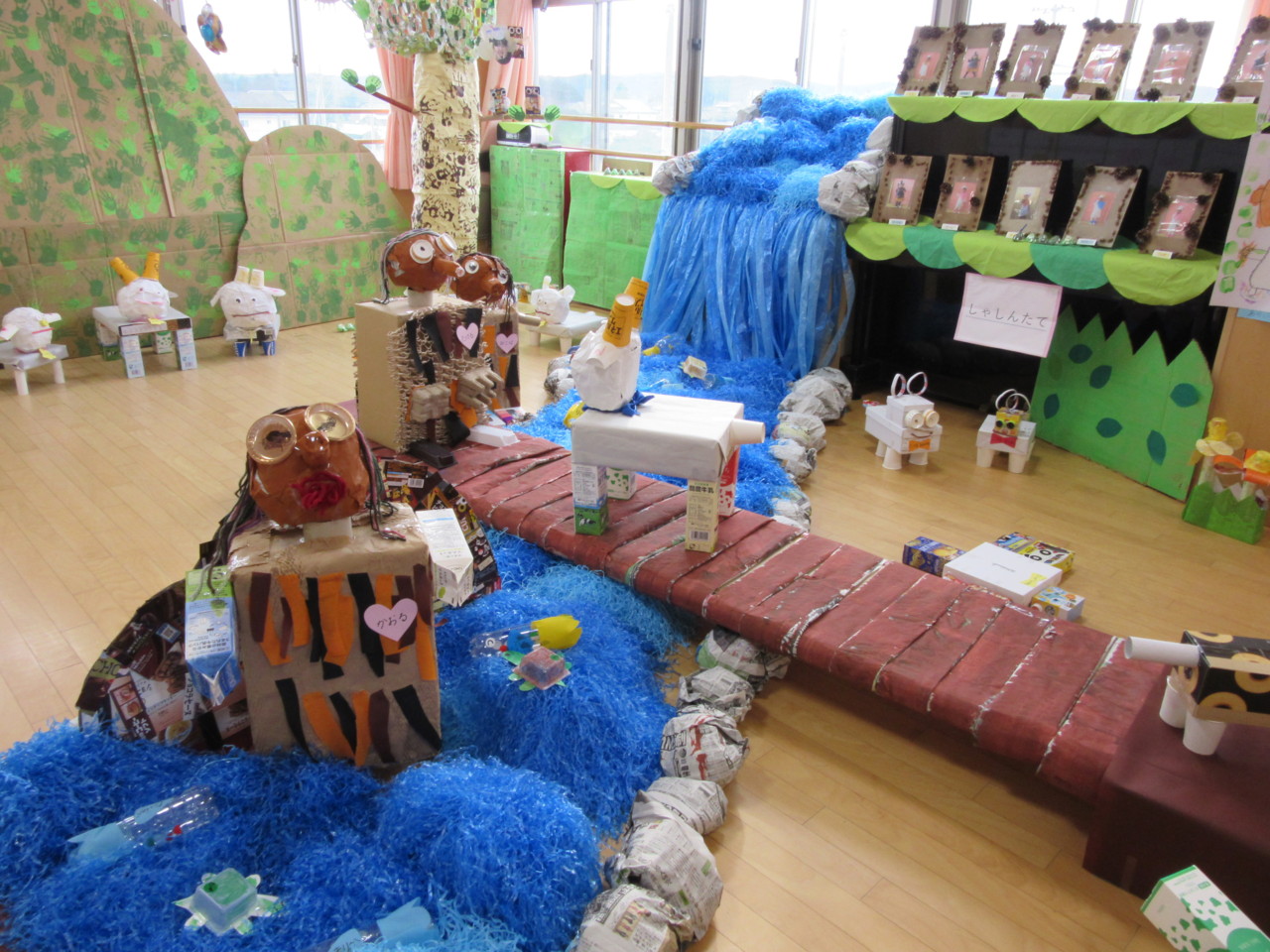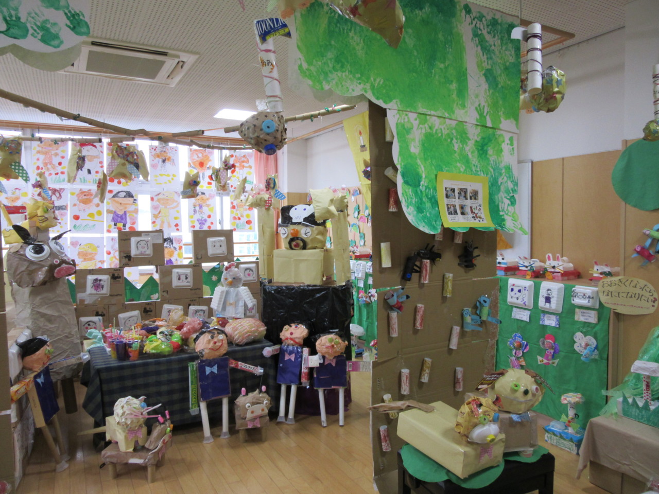 ご家庭からご協力いただいた廃品を使ってクラスごとのテーマに沿ってたくさんの作品が展示されました。