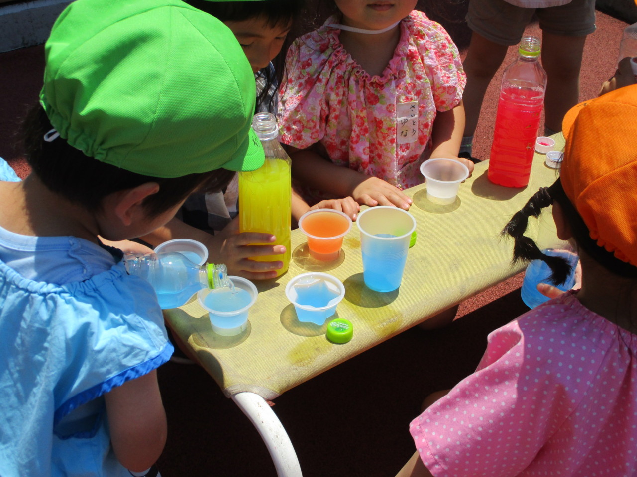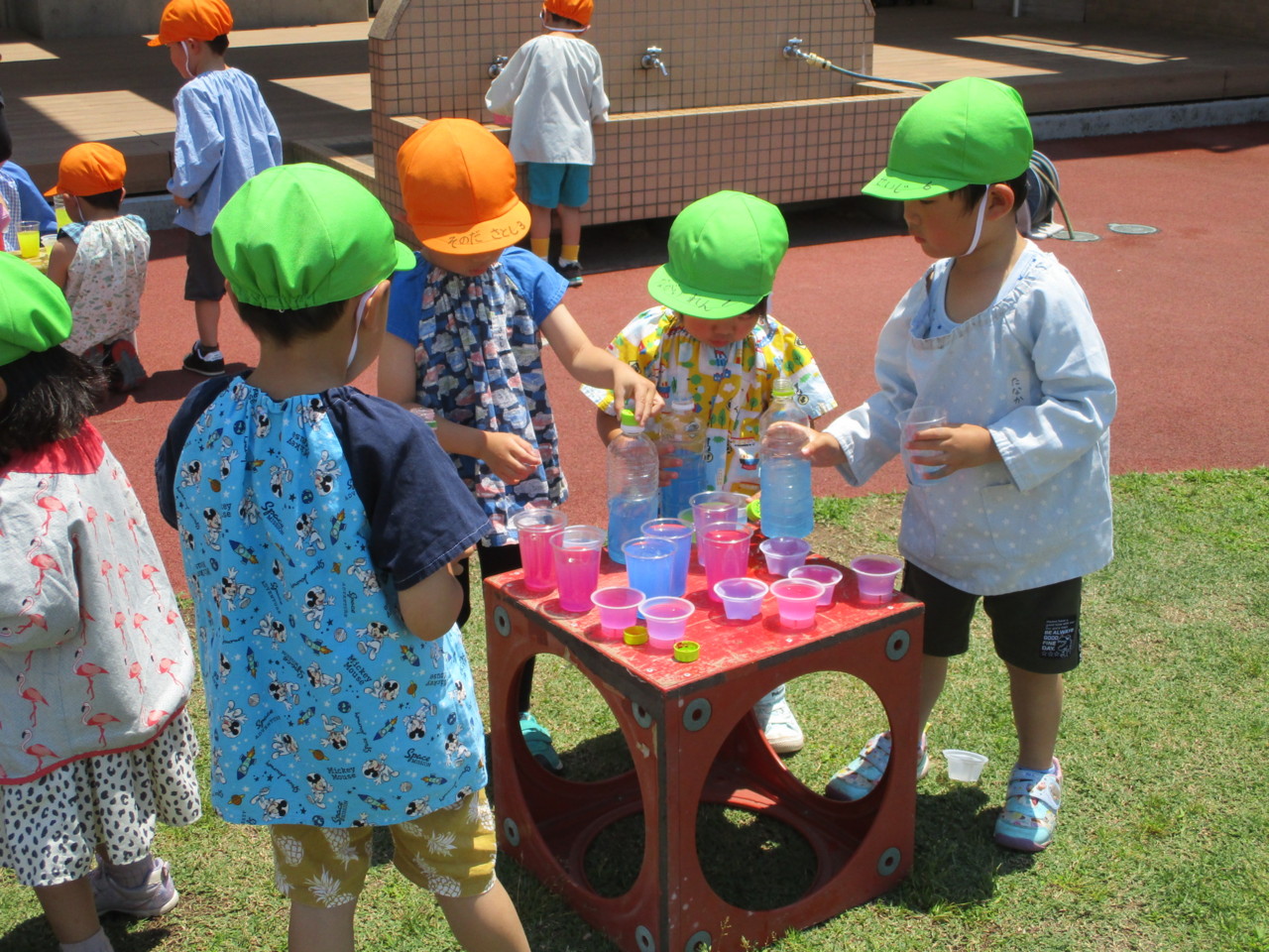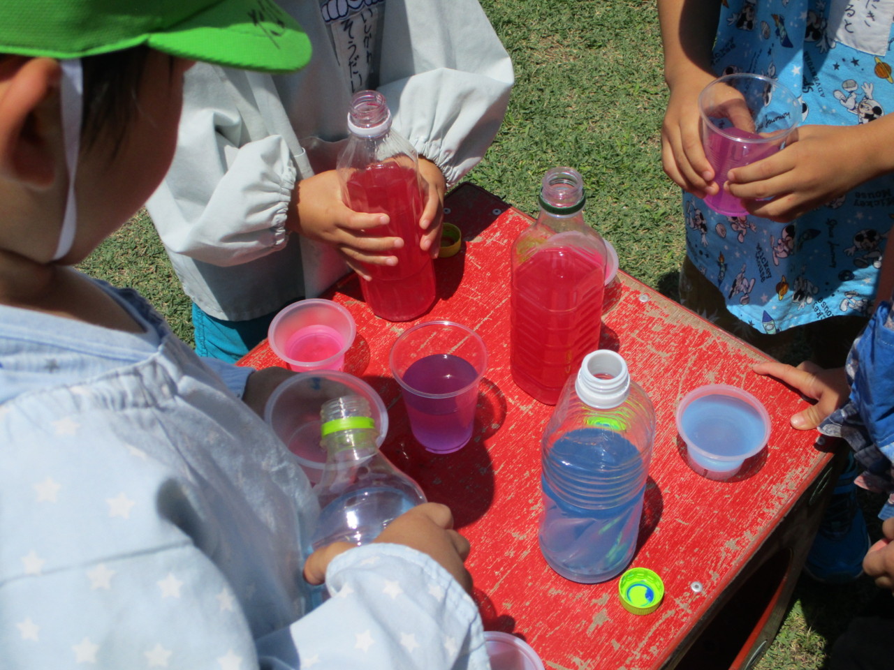 お天気の日、うさぎ組全員で園庭で色水遊びを楽しみました。