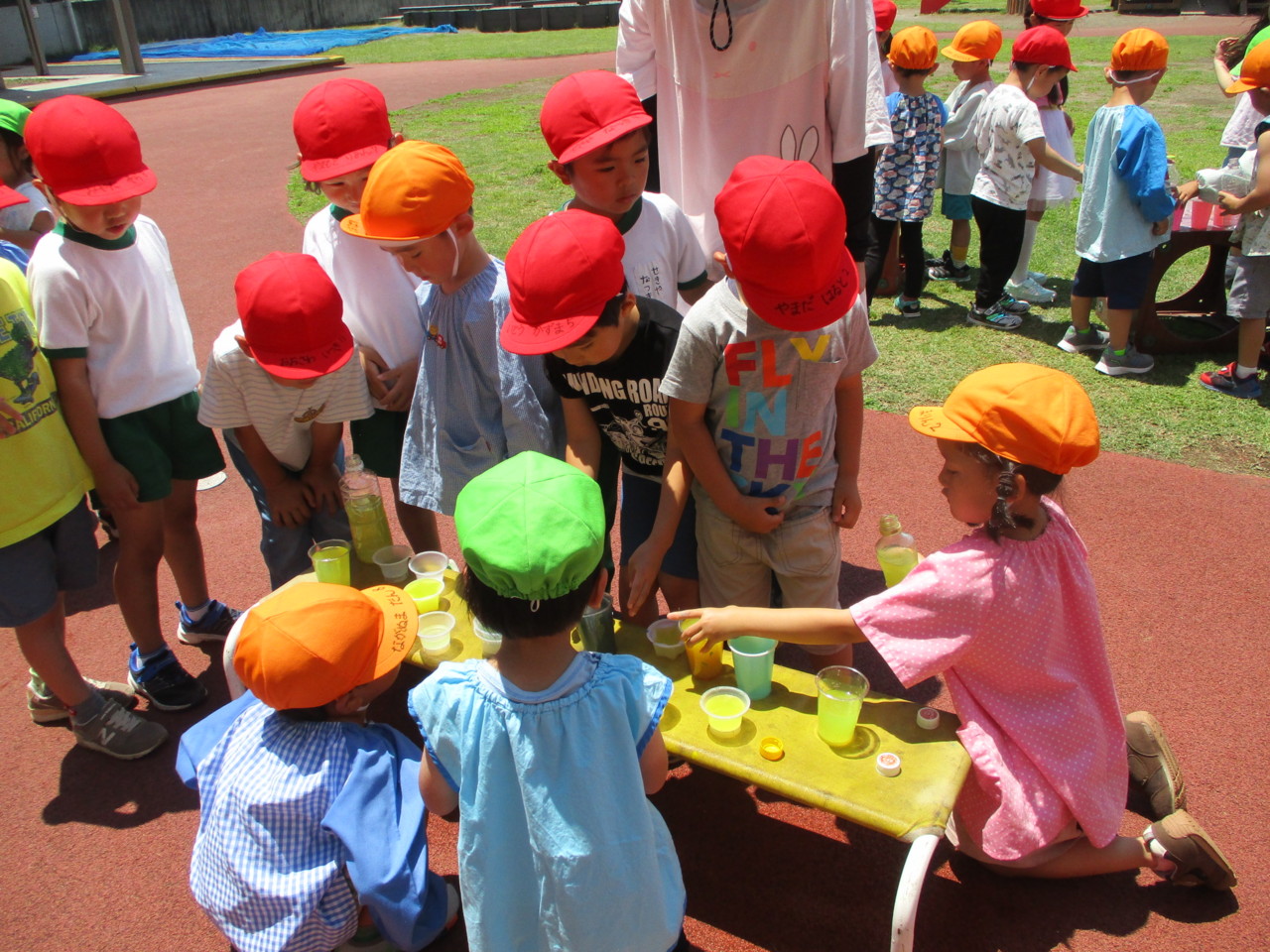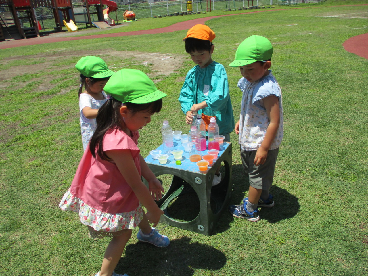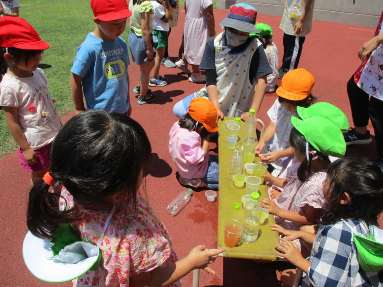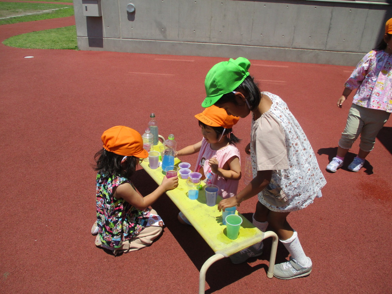 お天気の日、うさぎ組全員で園庭で色水遊びを楽しみました。