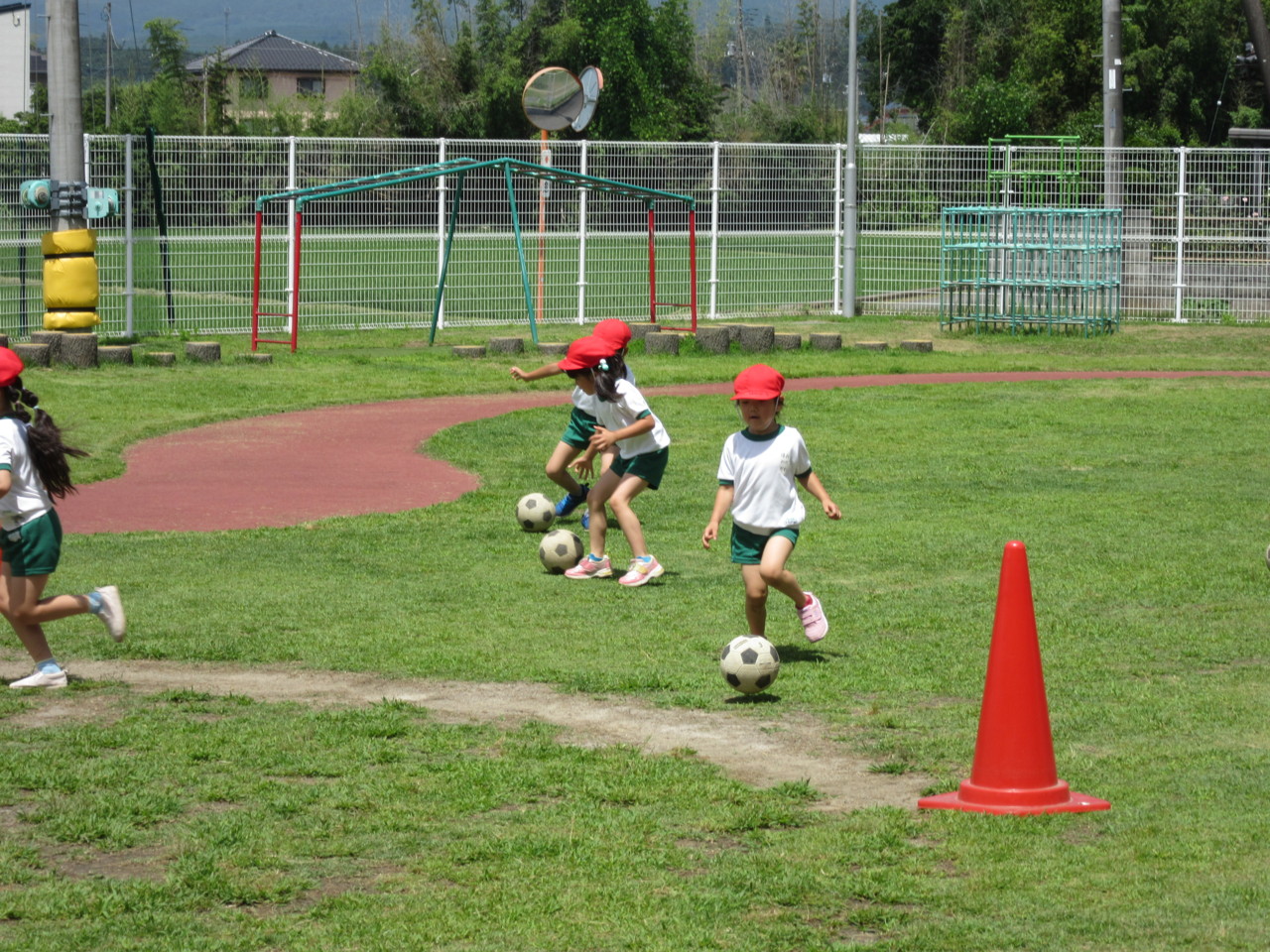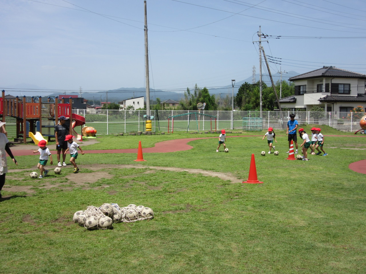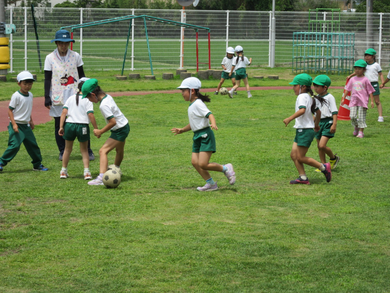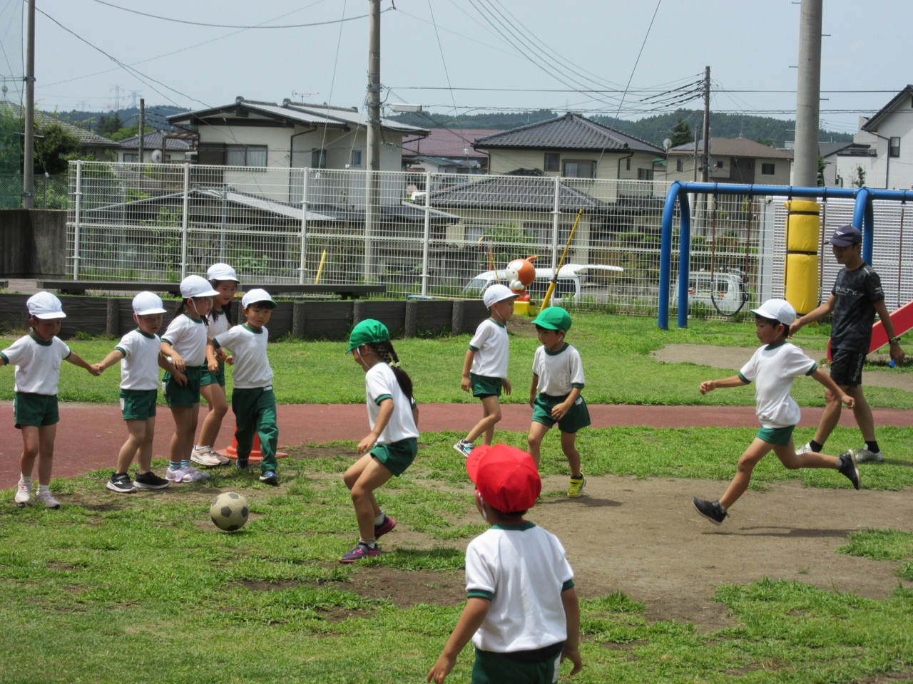 暑さにも負けず、ボールを追い、ルールも分かってきて、自分のチーム・敵チームを意識し、競争心を持ってゲームなども楽しめるようになってきました。