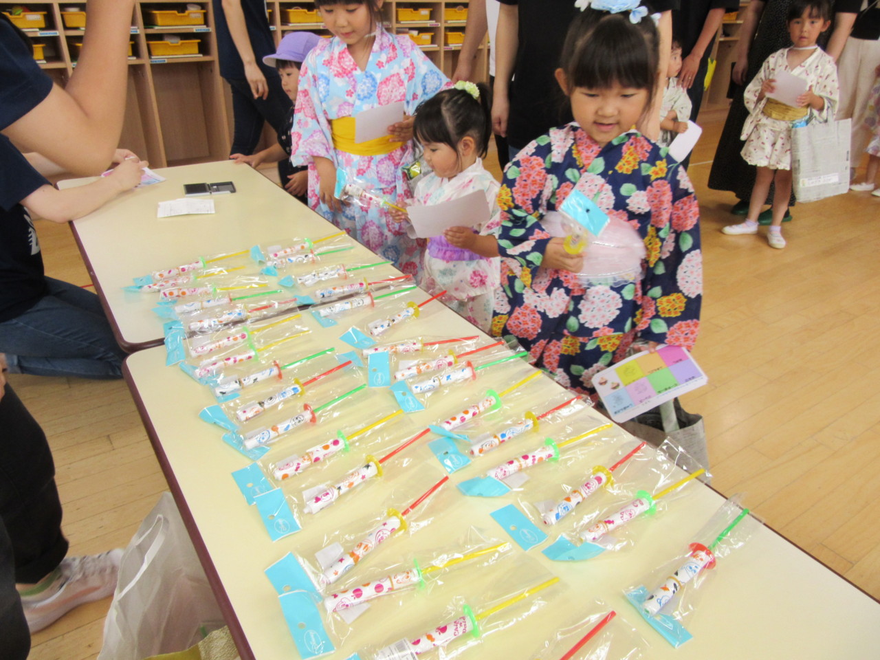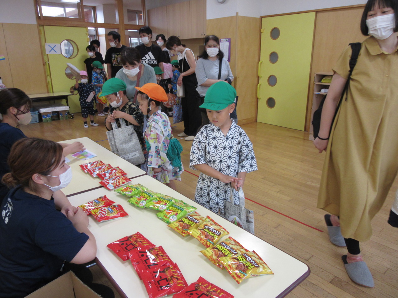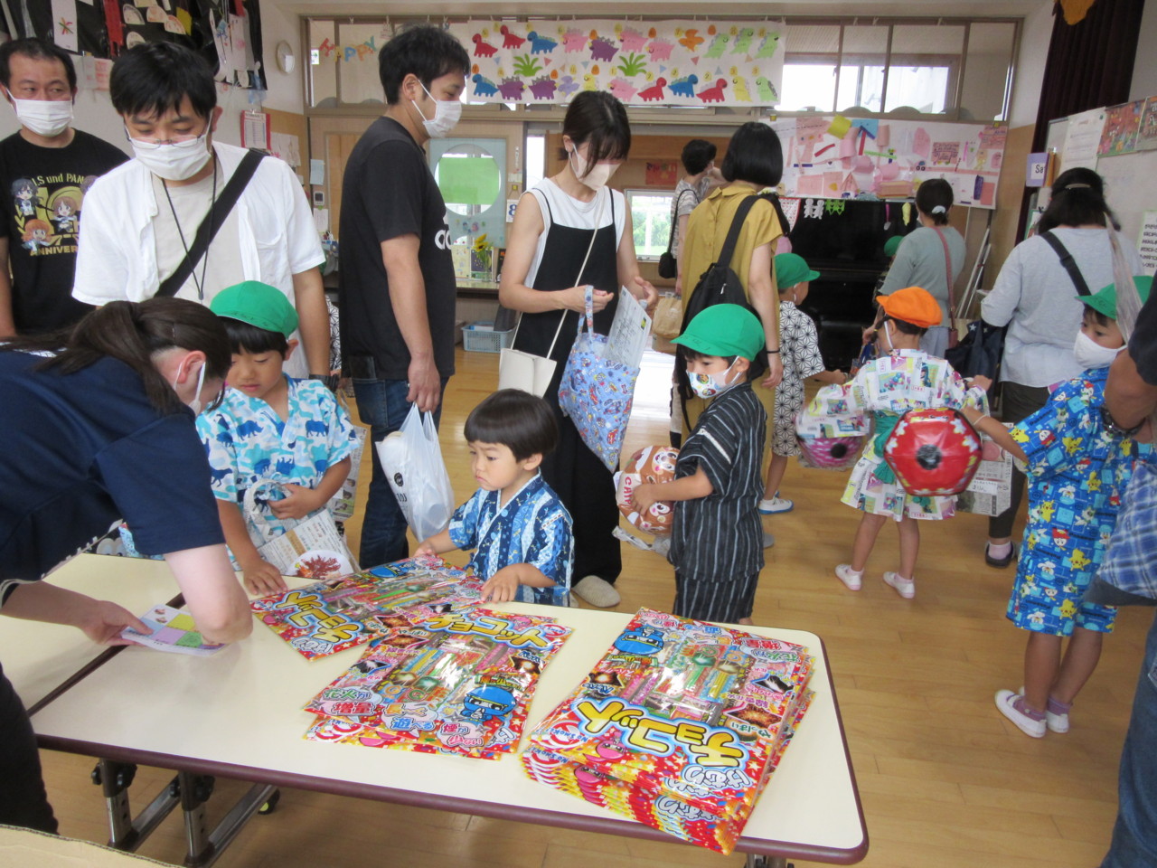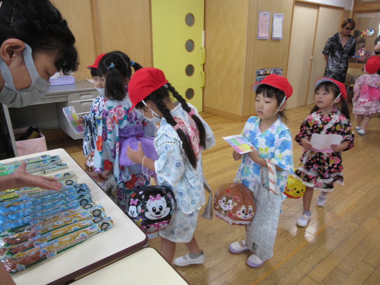 あいにくの天気の為、園舎内での実施となりましたが、親子で模擬店巡り・音頭・ゲームなどを楽しんでいただきました。