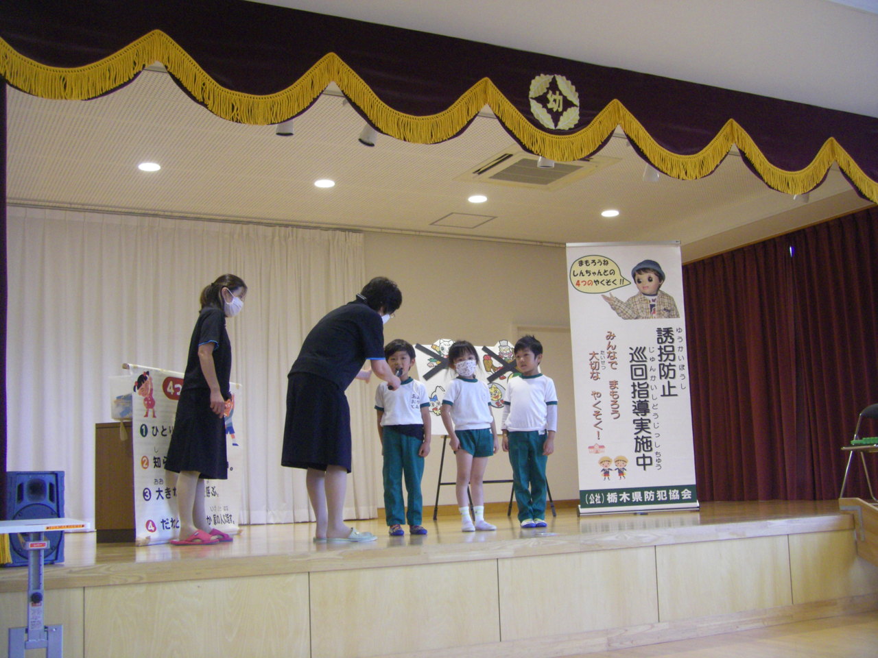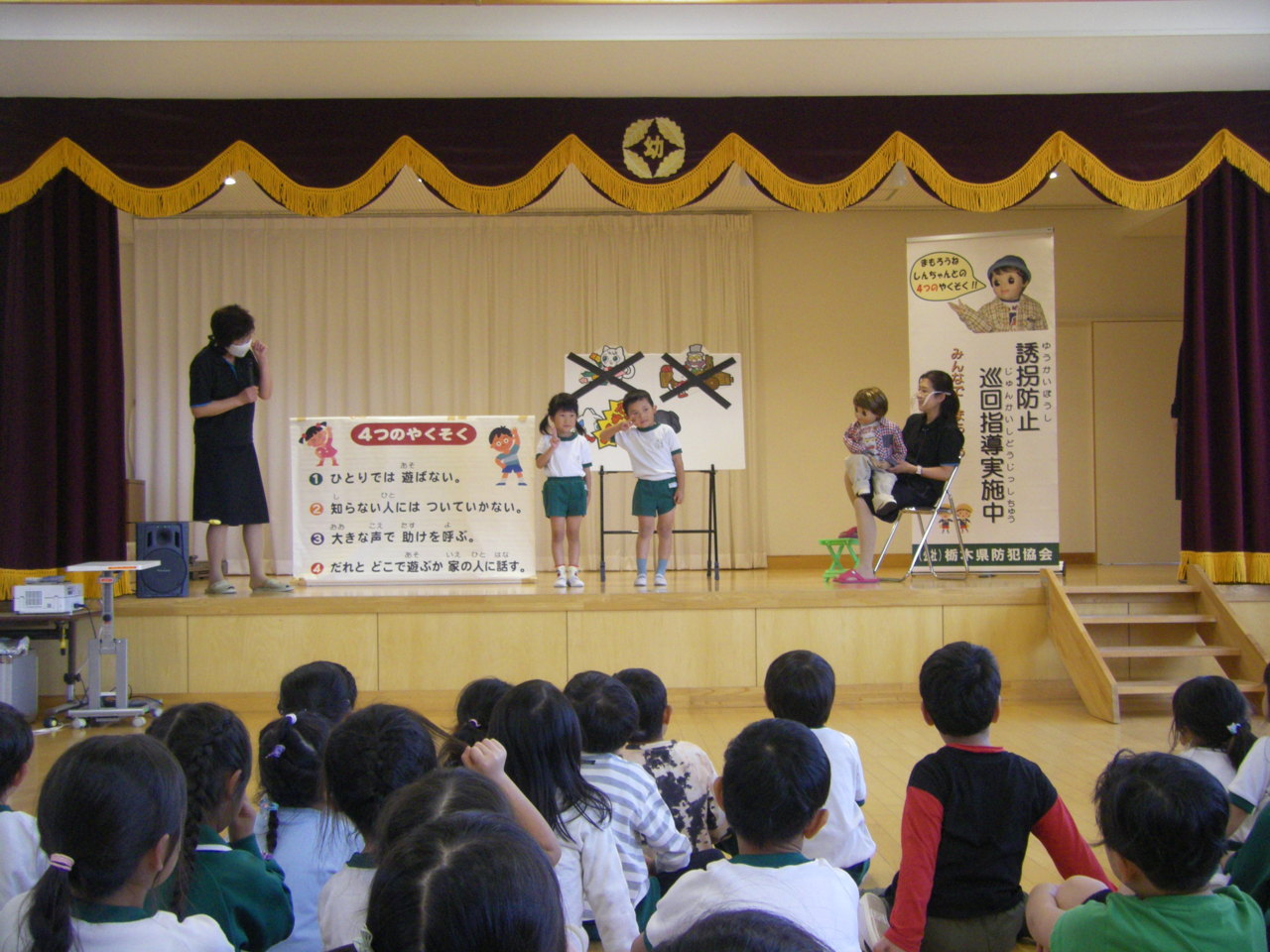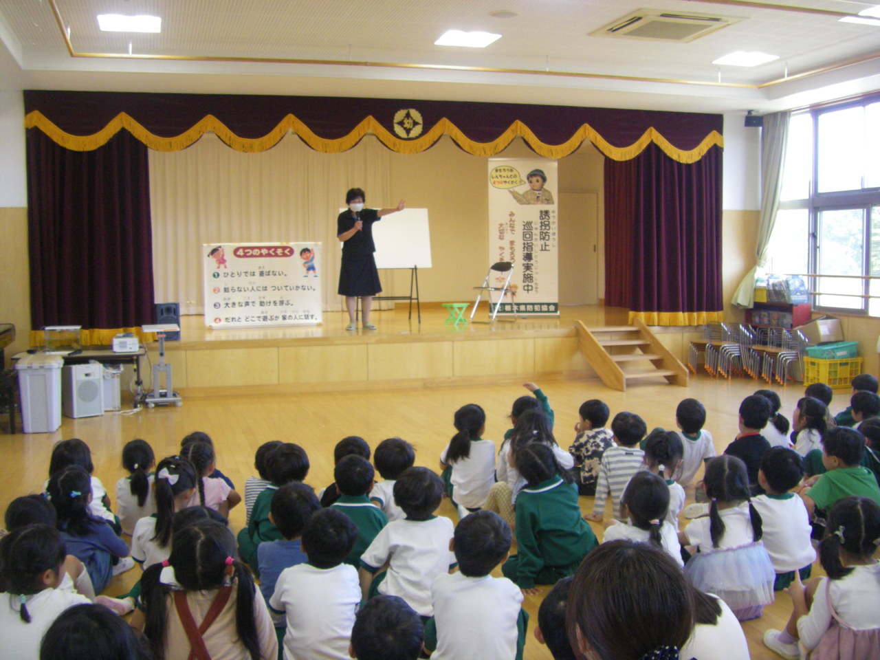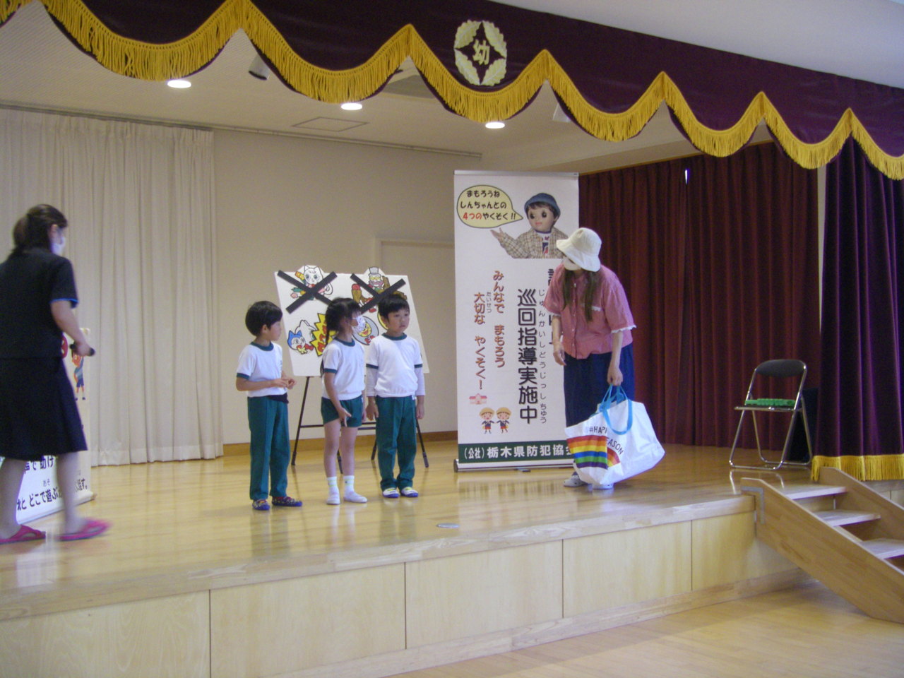 栃木県防犯協会のご指導の下、きりん・うさぎ組が防犯教室を行いました。