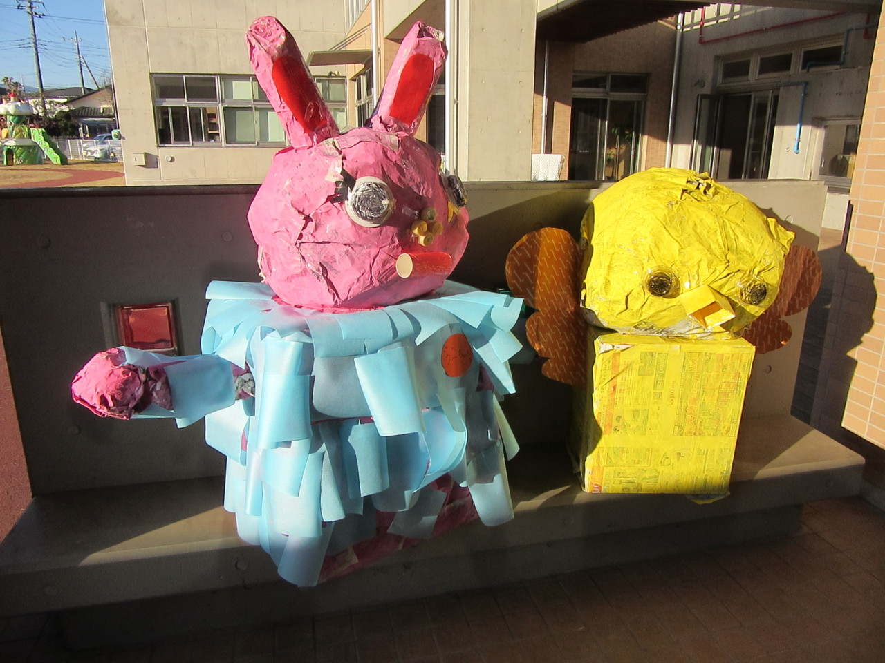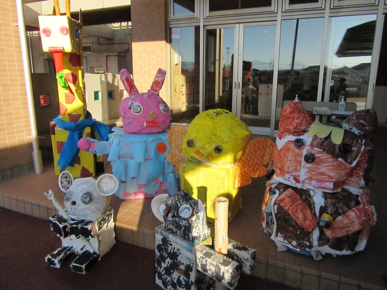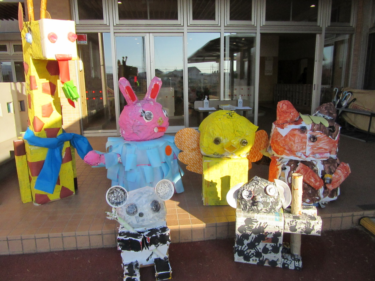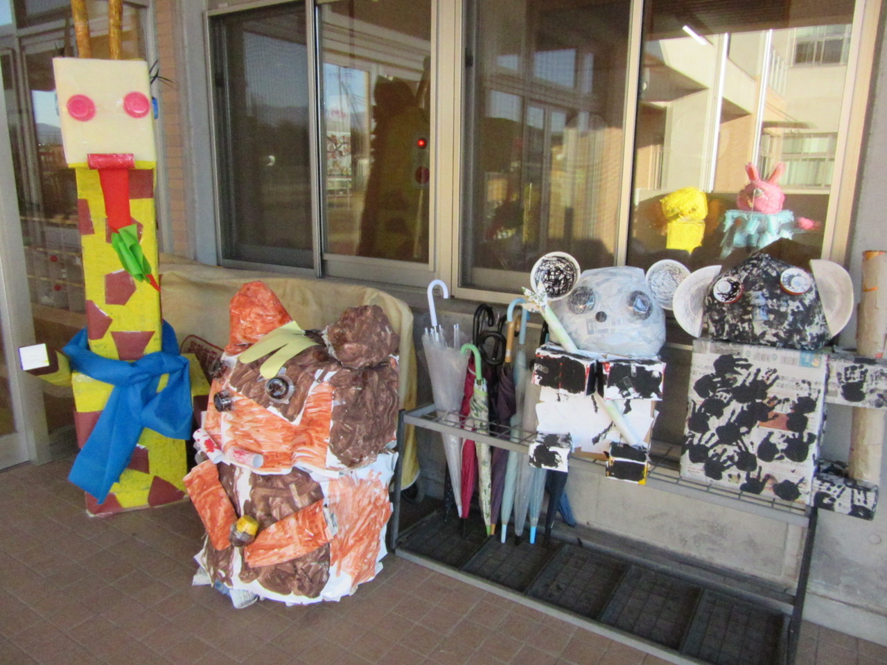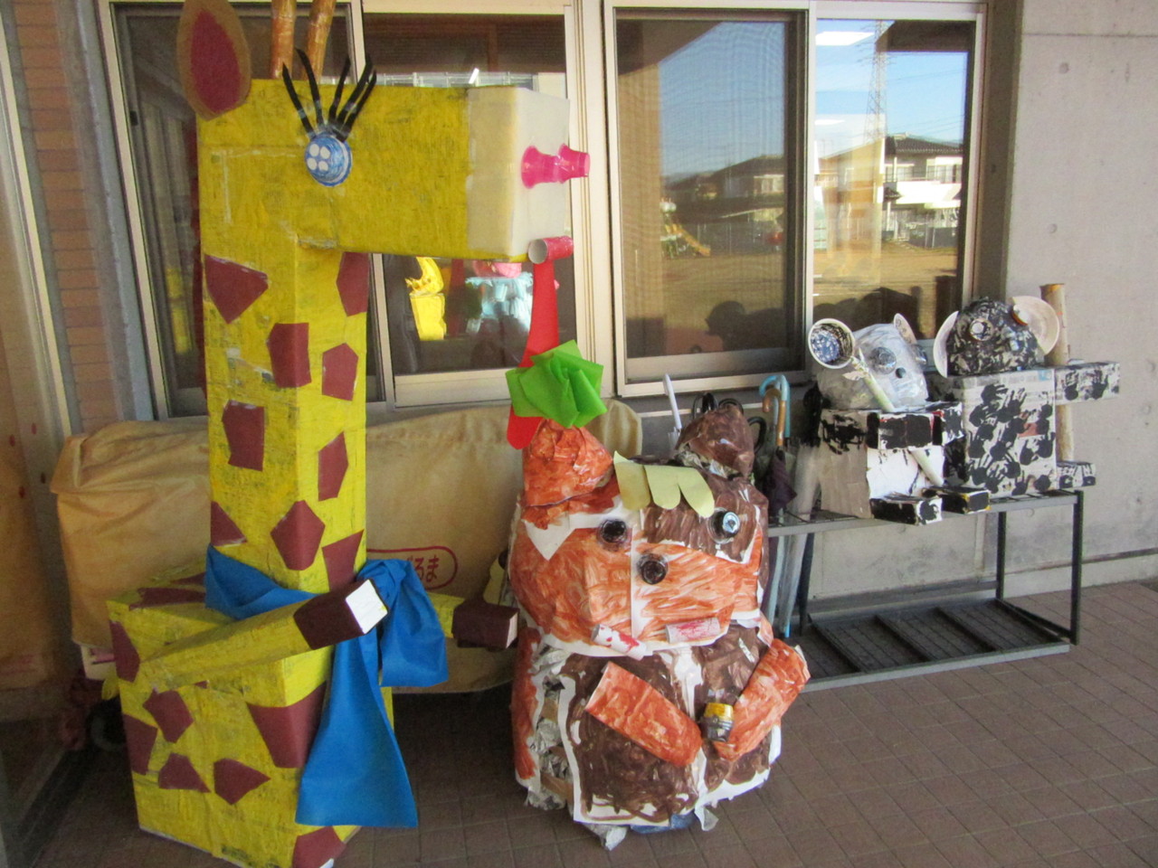 廃品を利用して、自分の学年の動物を案山子にしました。