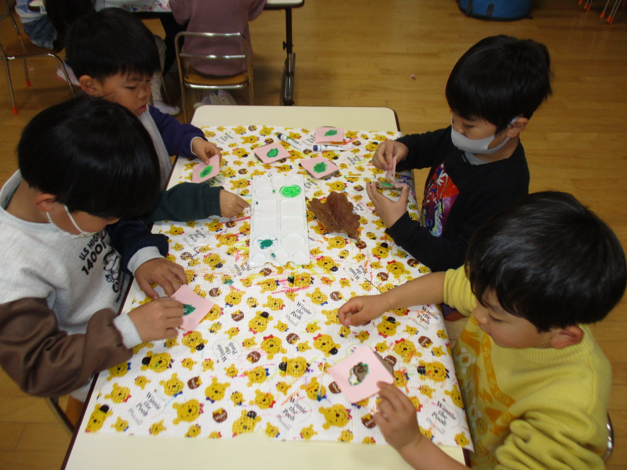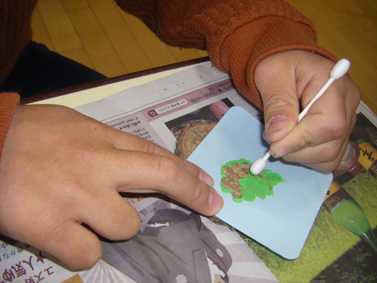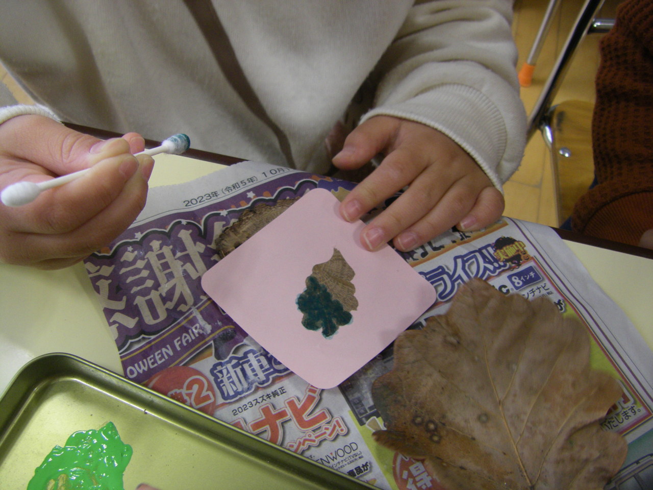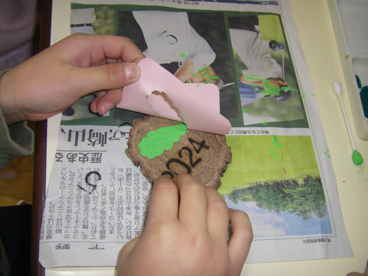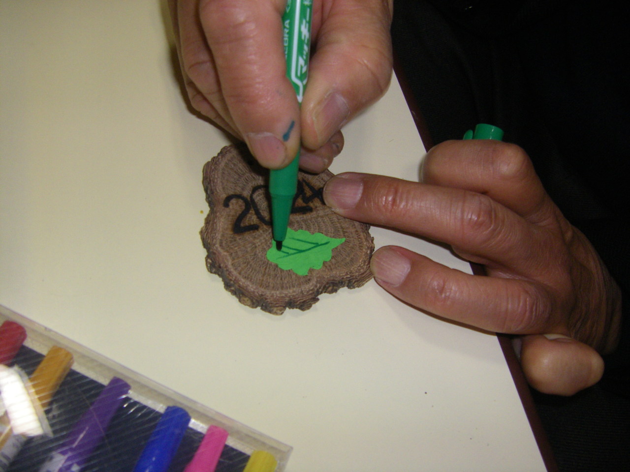 柏の木を薄く切ったメダルに、柏の葉を型取り記念品作りをしています。