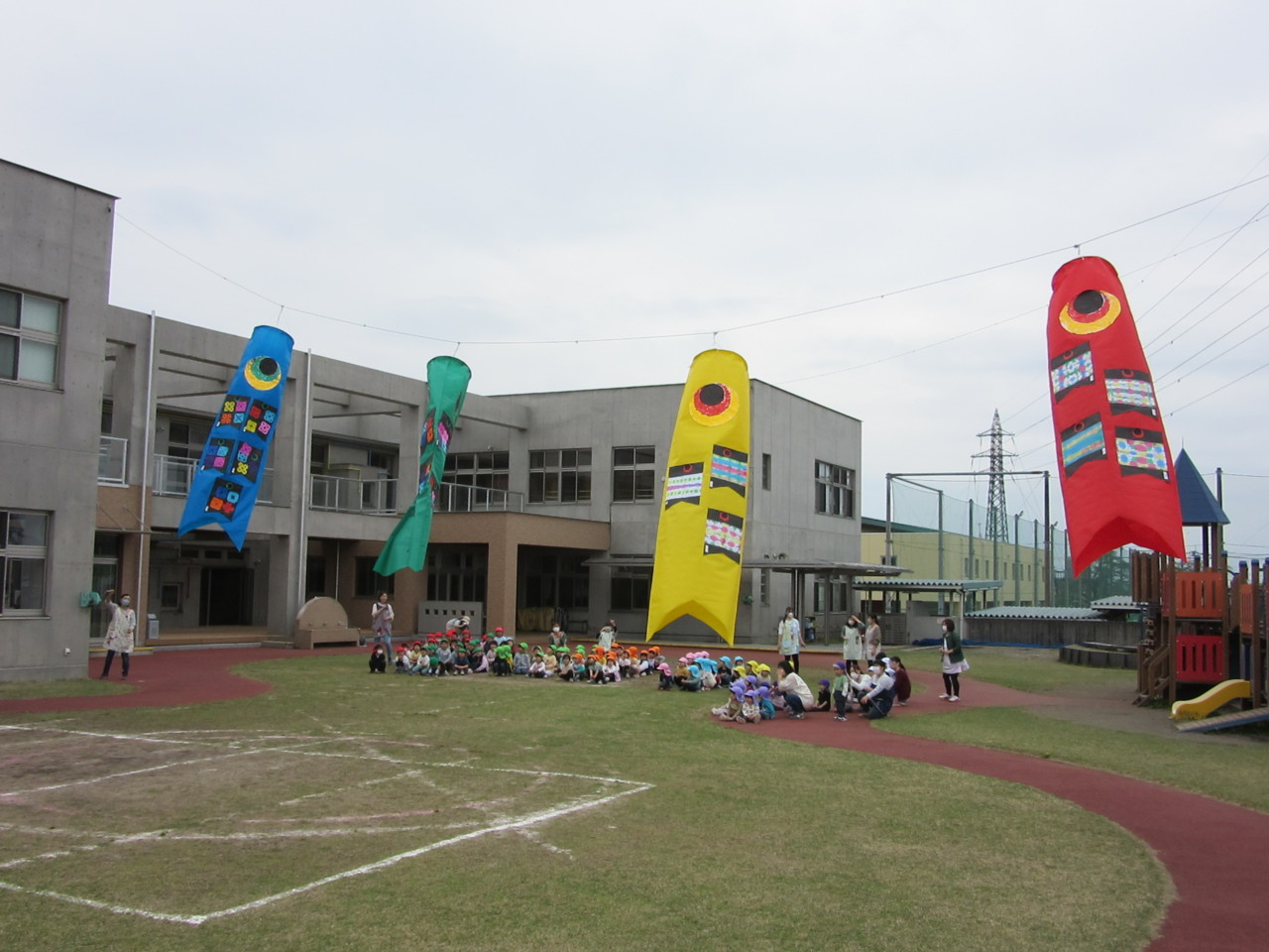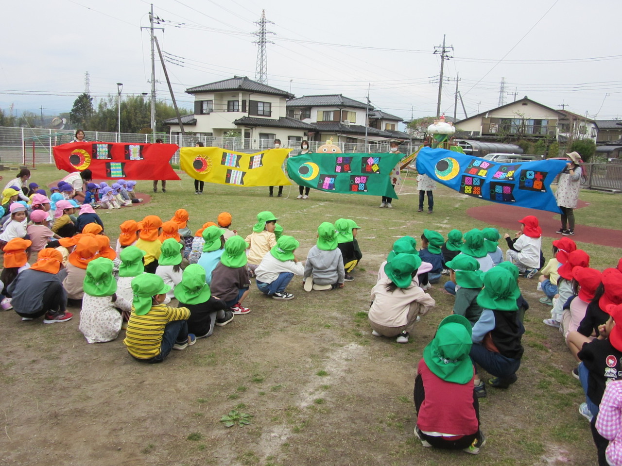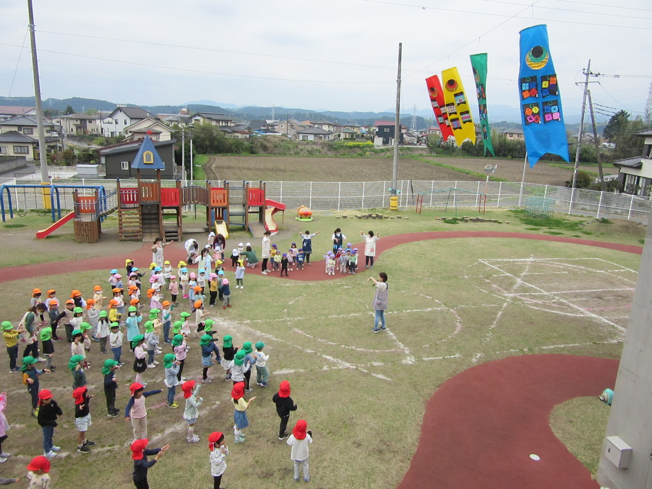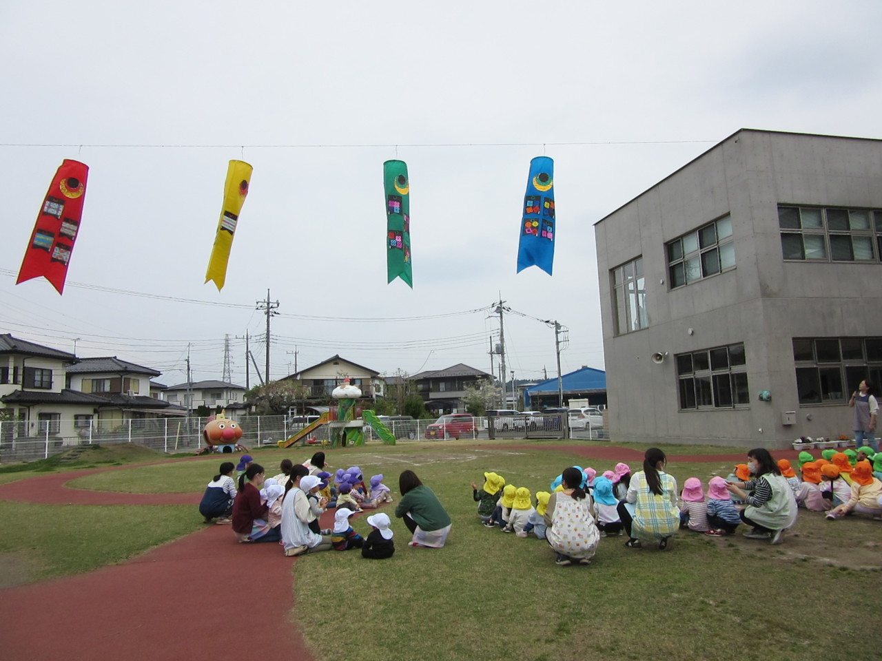 園児全員で、こいのぼりを揚げ、体操をして集会を楽しみました。