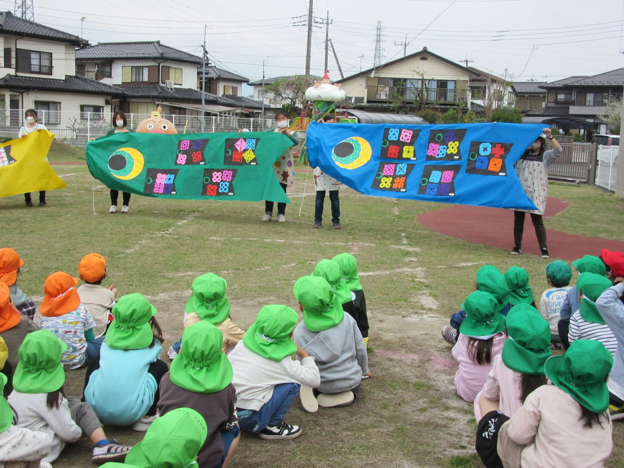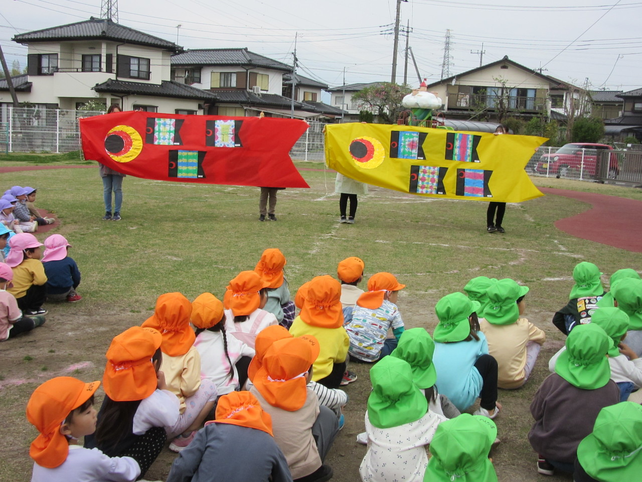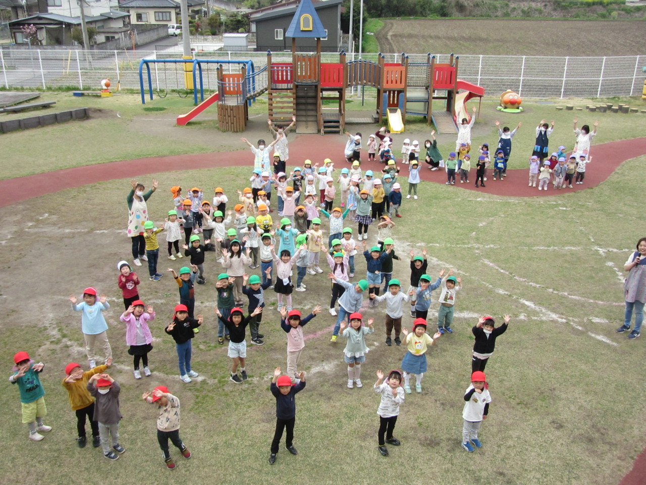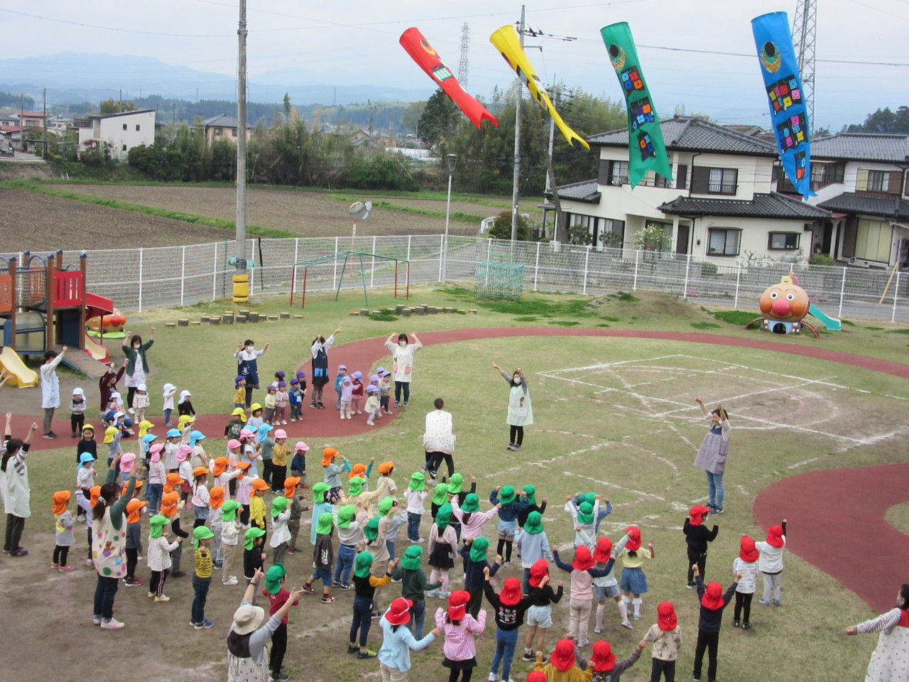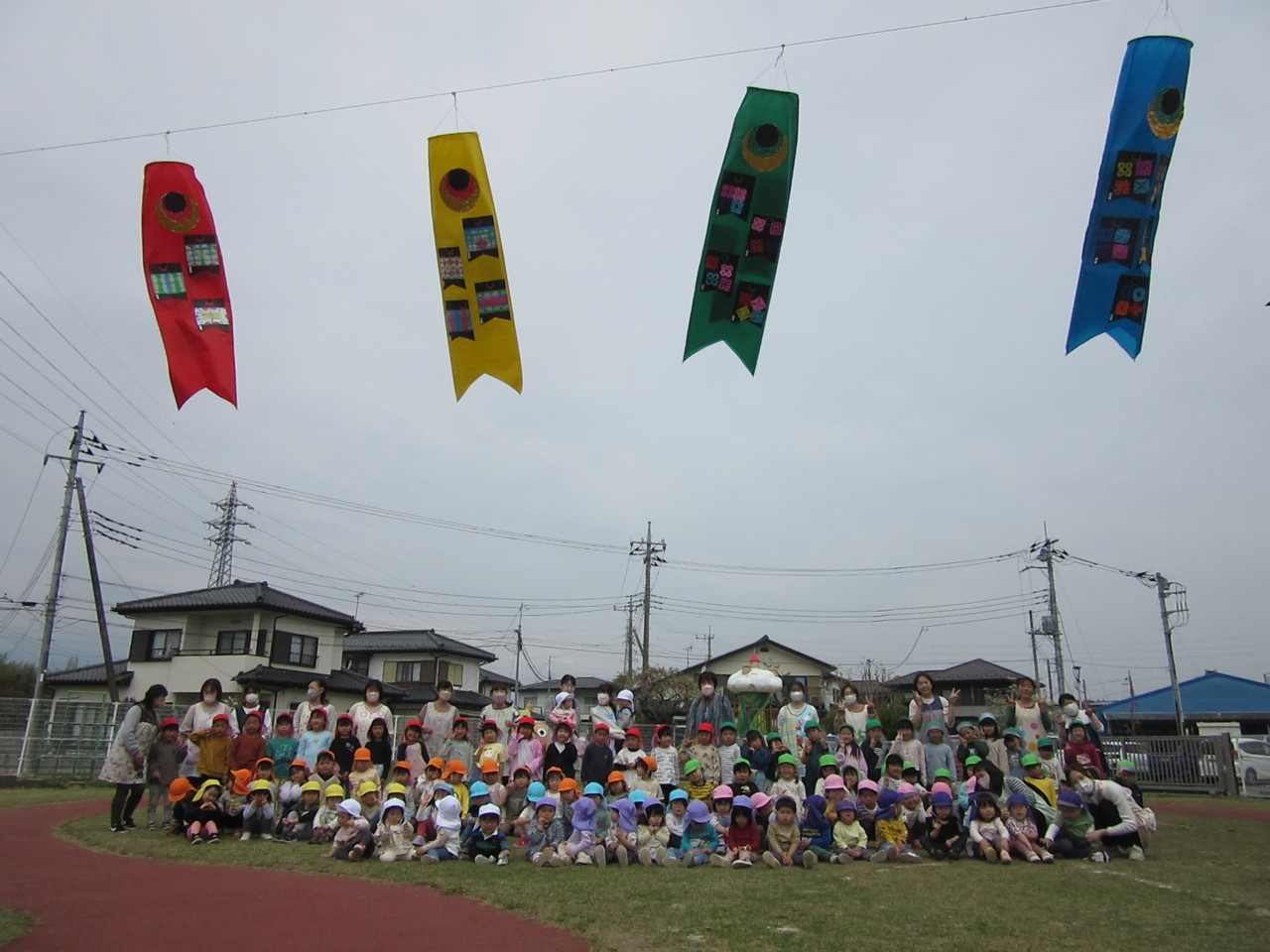 園児全員で、こいのぼりを揚げ、体操をして集会を楽しみました。