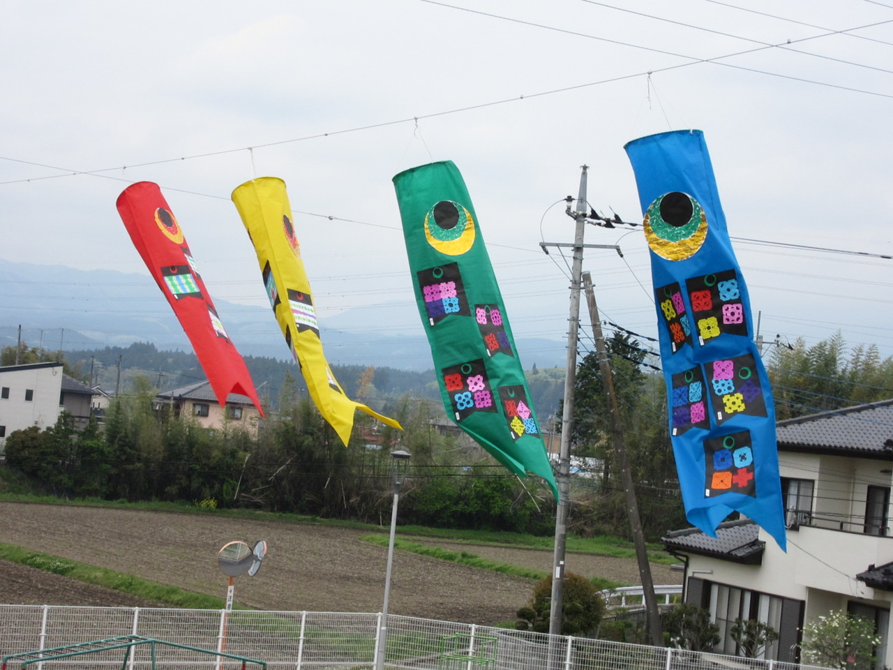 きりん組(年長組)がクラスごとに共同で作った大きなこいのぼりを園庭に高く揚がりました。