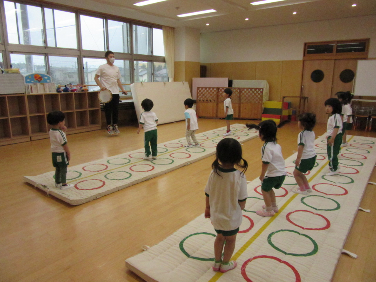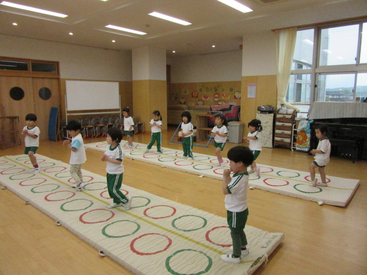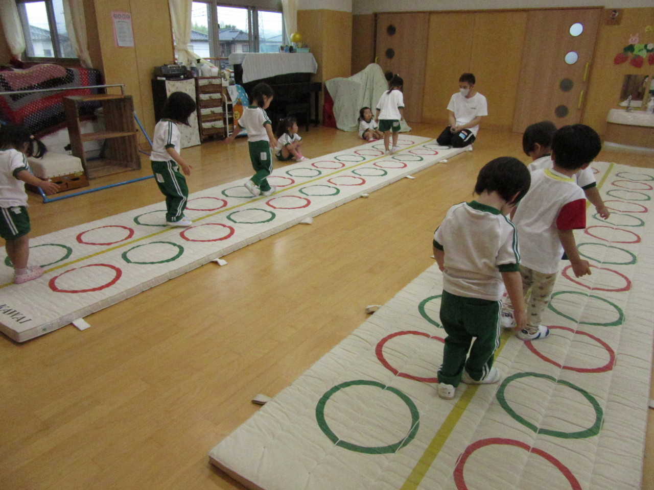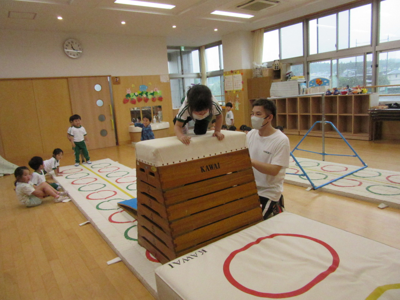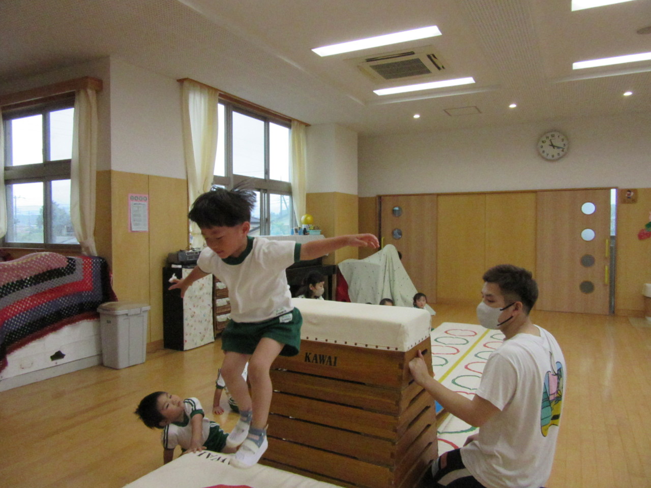 カワイ体操教室の講師の指導の下、いろいろな運動に興味をもって楽しく体操教室ができました。