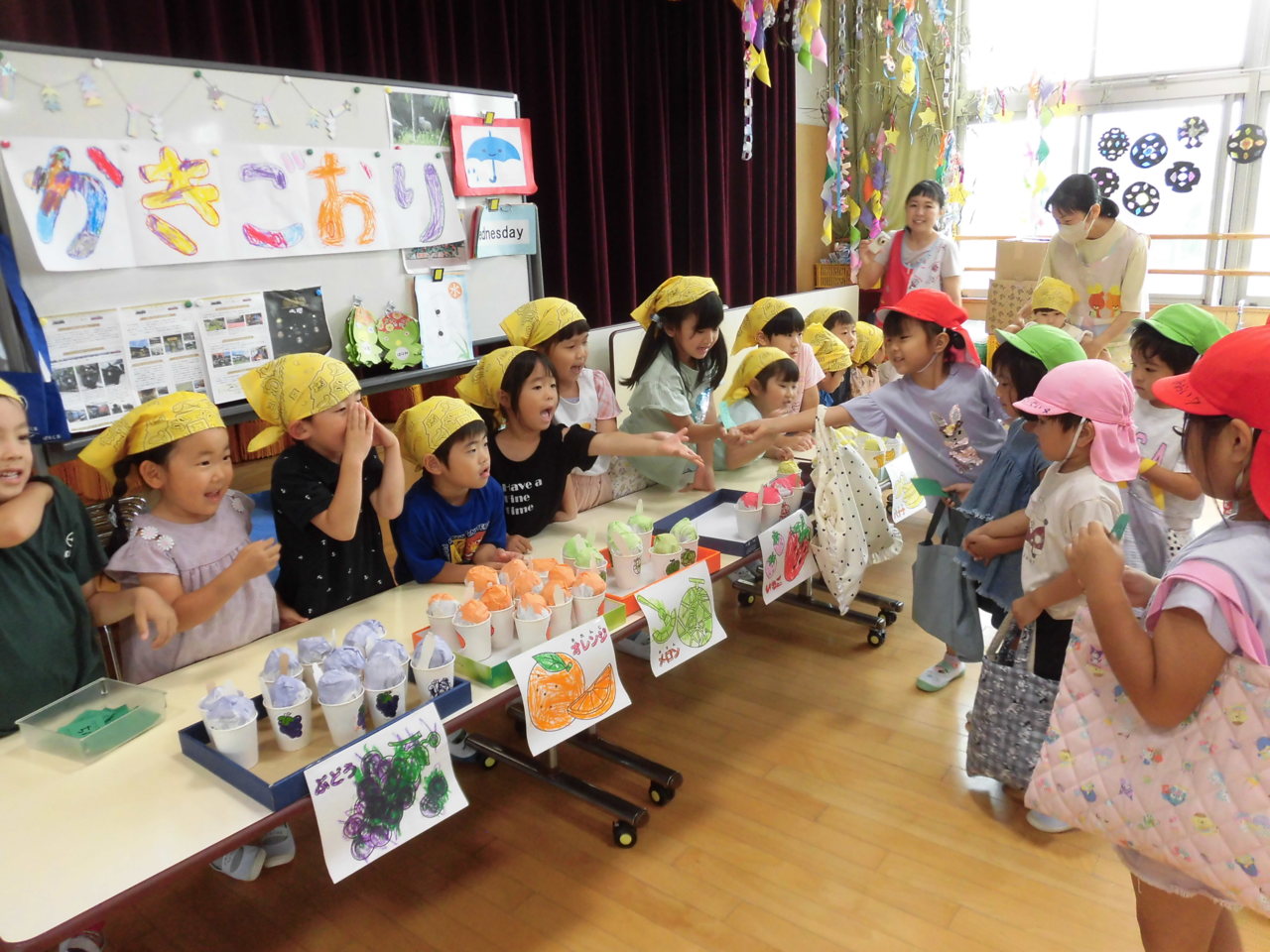 廃品で作ったものをお店屋さんになったり、お客さんになってお買い物ごっこを楽しみました。