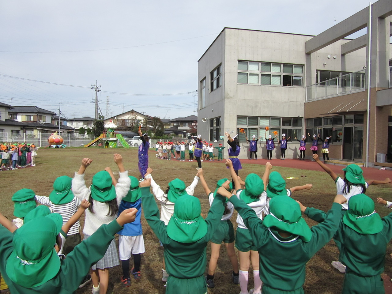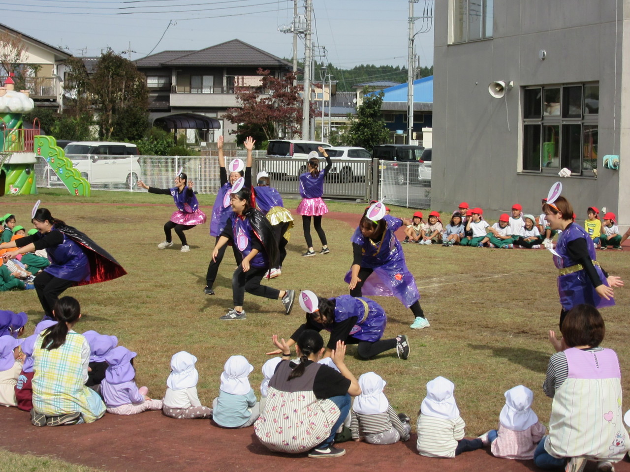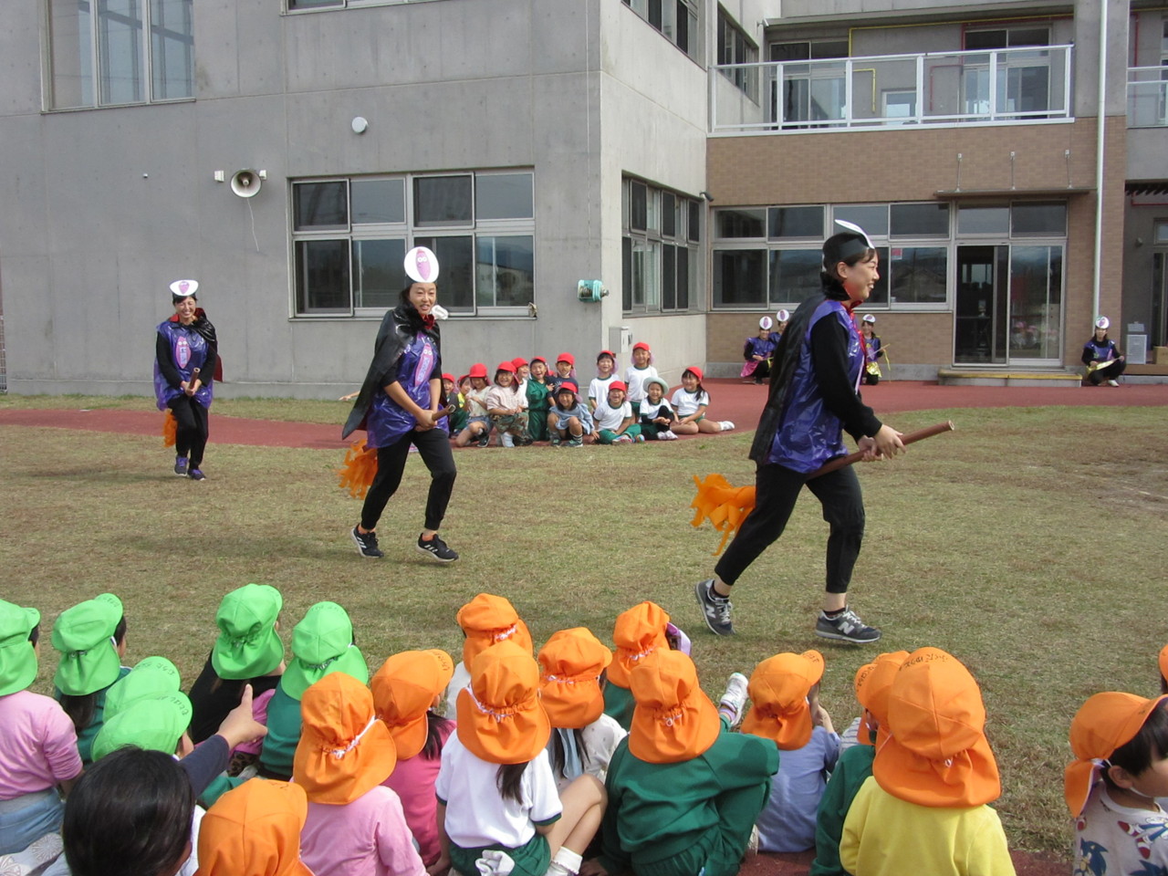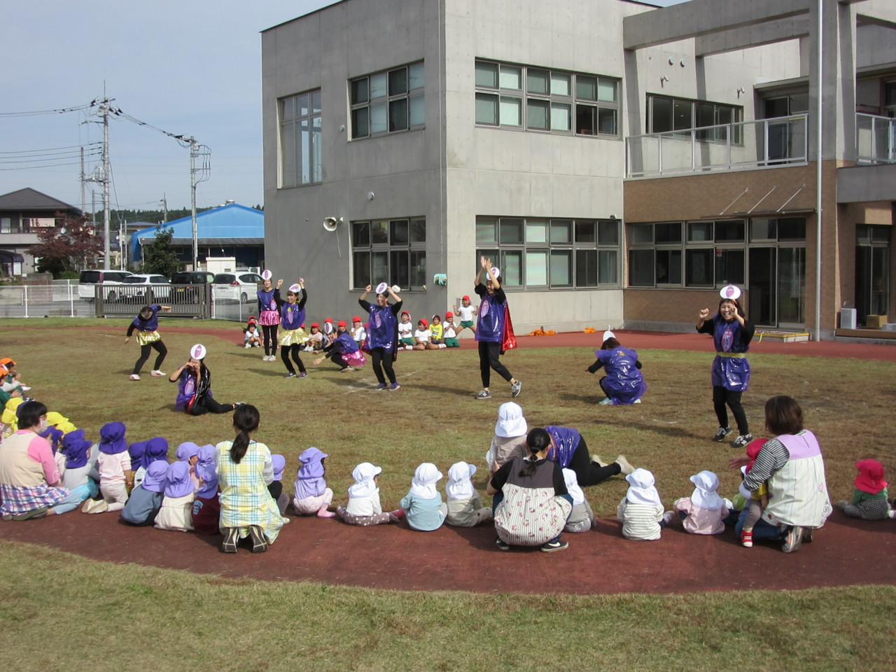 全園児で秋晴れの中、体操をしたり歌を歌ったり、お芋に扮した先生たちの寸劇を見て楽しみました。