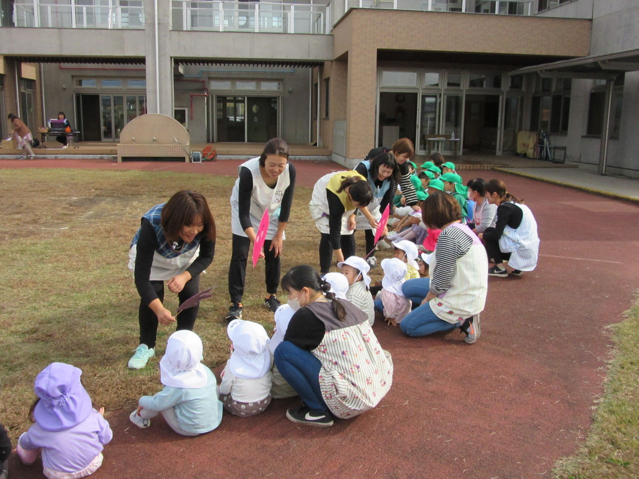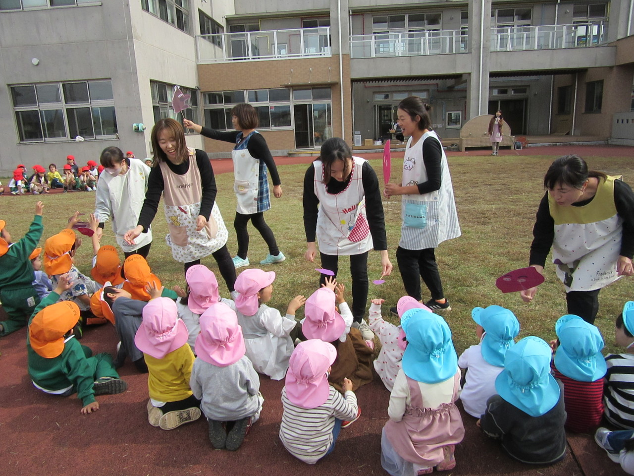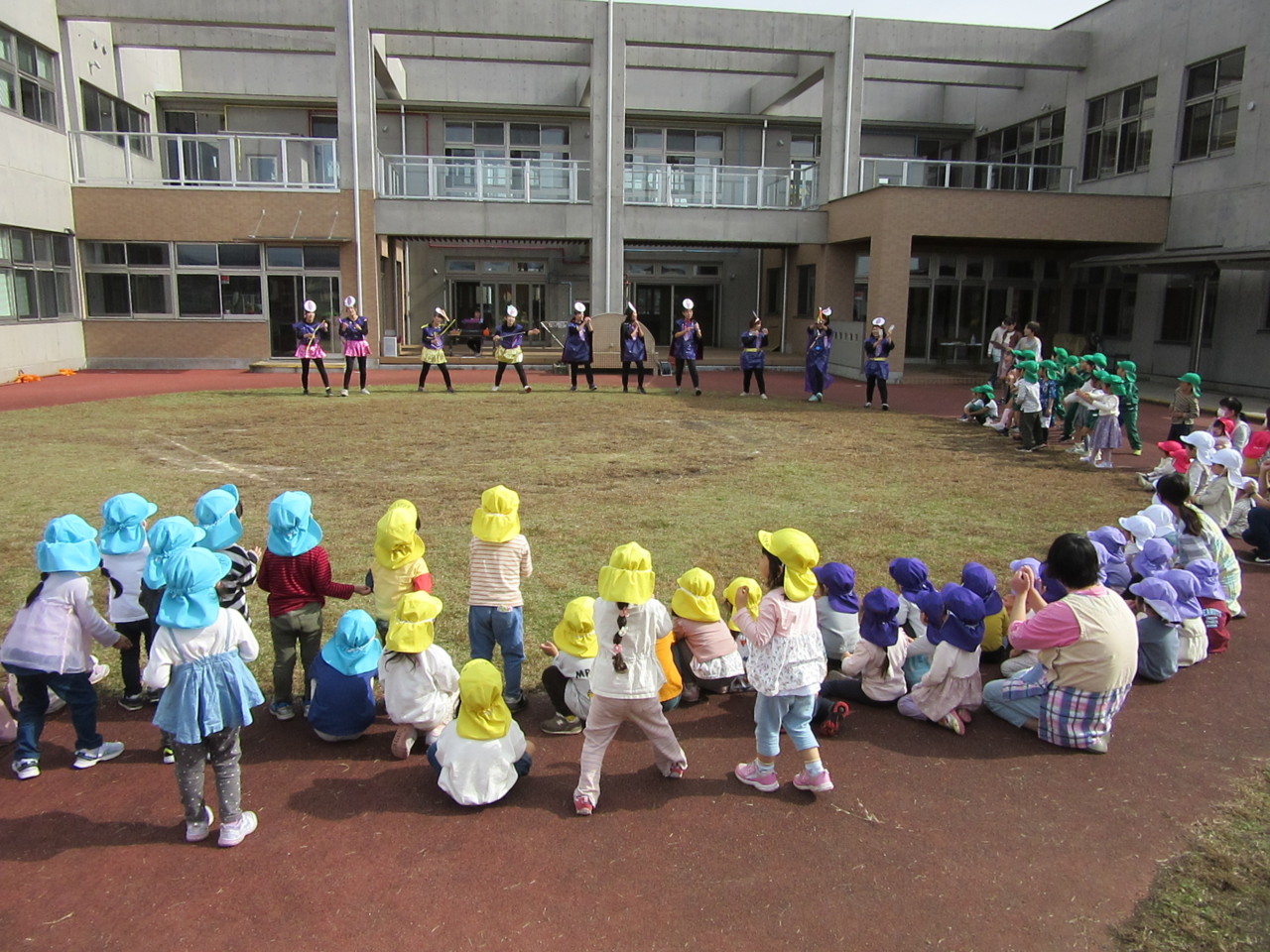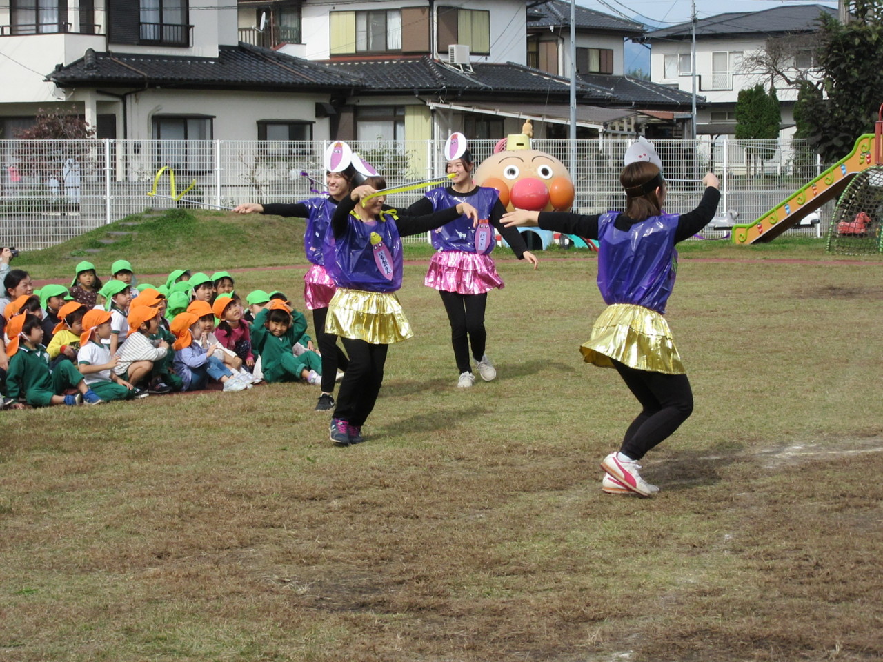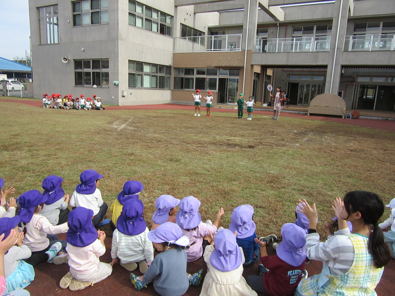 全園児で秋晴れの中、体操をしたり歌を歌ったり、お芋に扮した先生たちの寸劇を見て楽しみました。