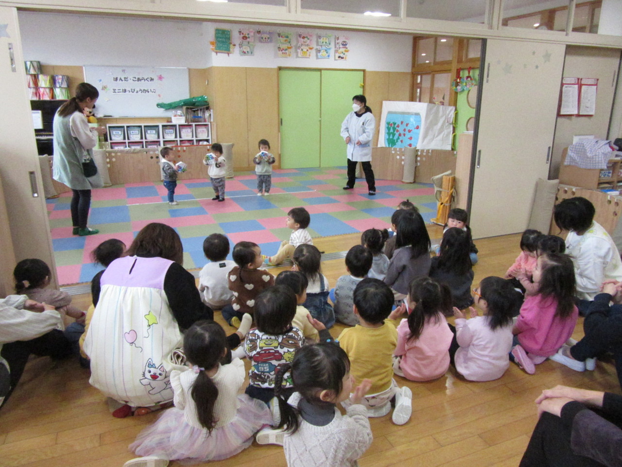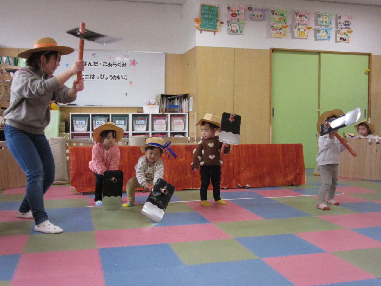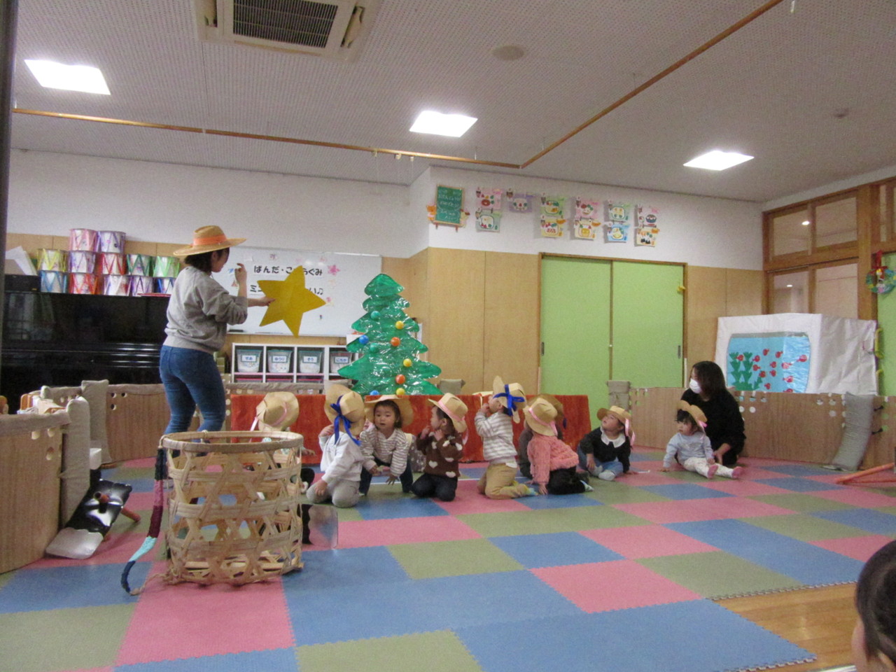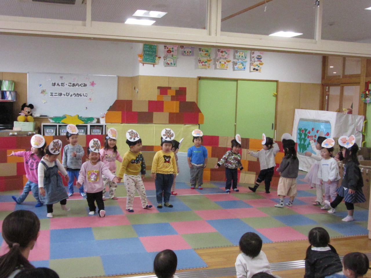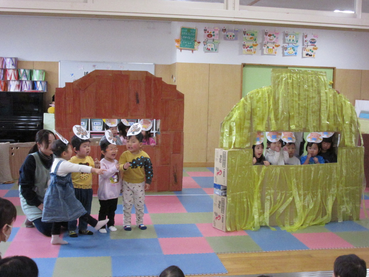こあら・ぱんだ組さんは歌や踊り、りす組は発表会で行った3びきの子ぶたの劇などを見せ合って楽しみました。
