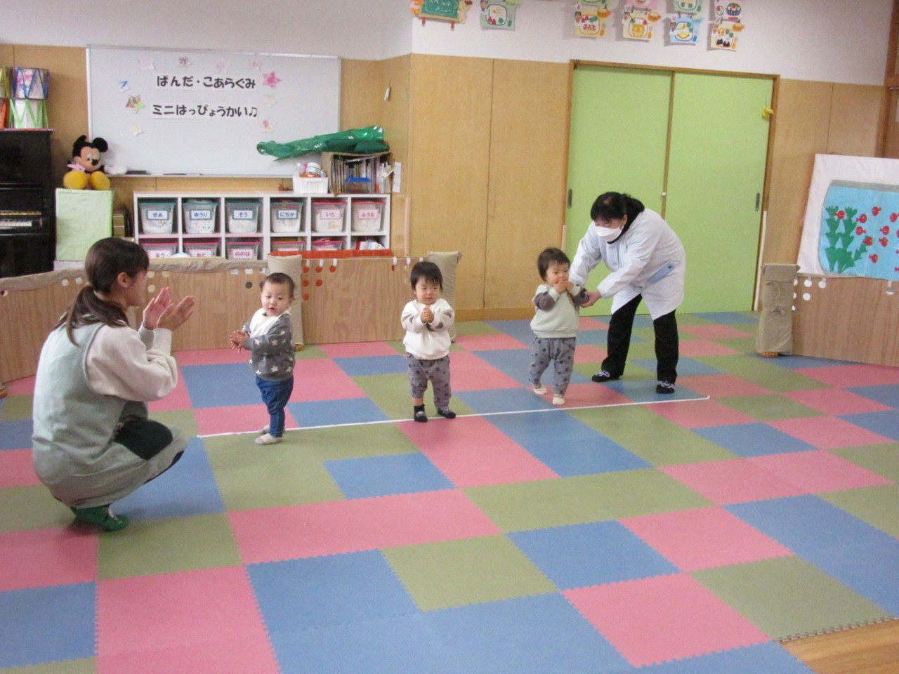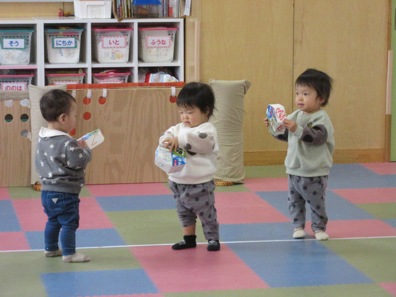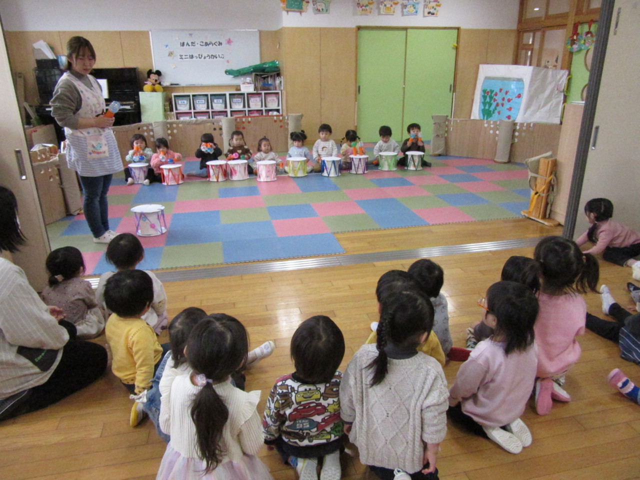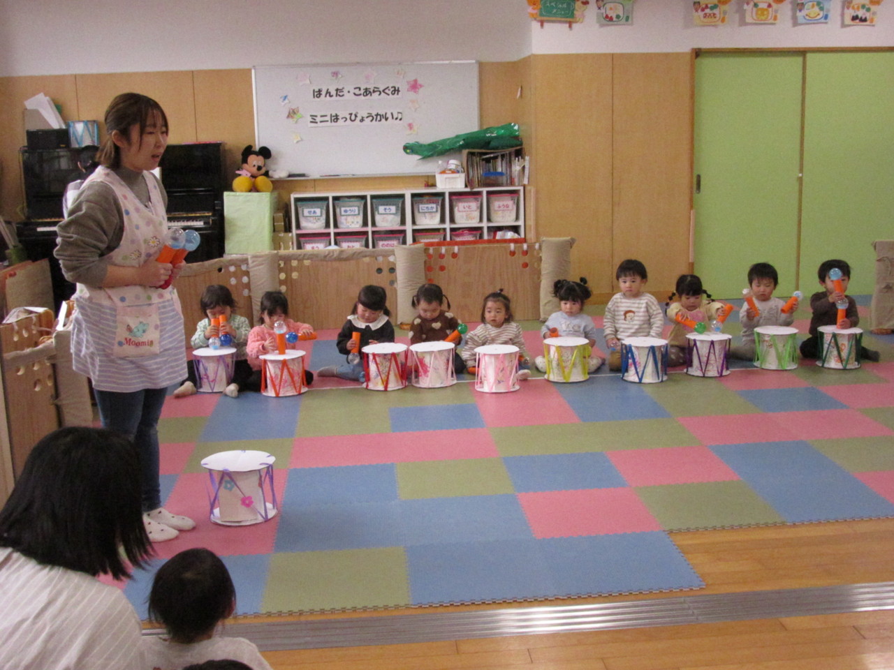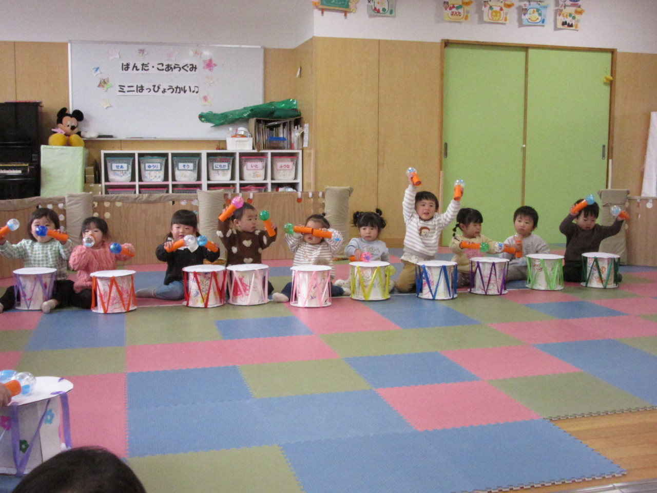 こあら・ぱんだ組さんは歌や踊り、りす組は発表会で行った3びきの子ぶたの劇などを見せ合って楽しみました。
