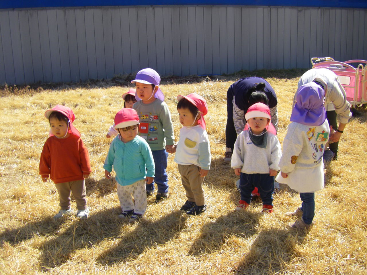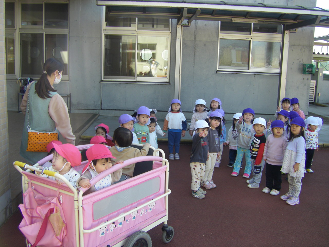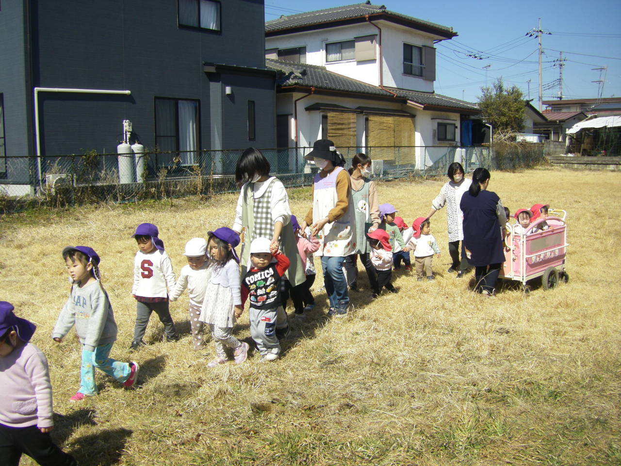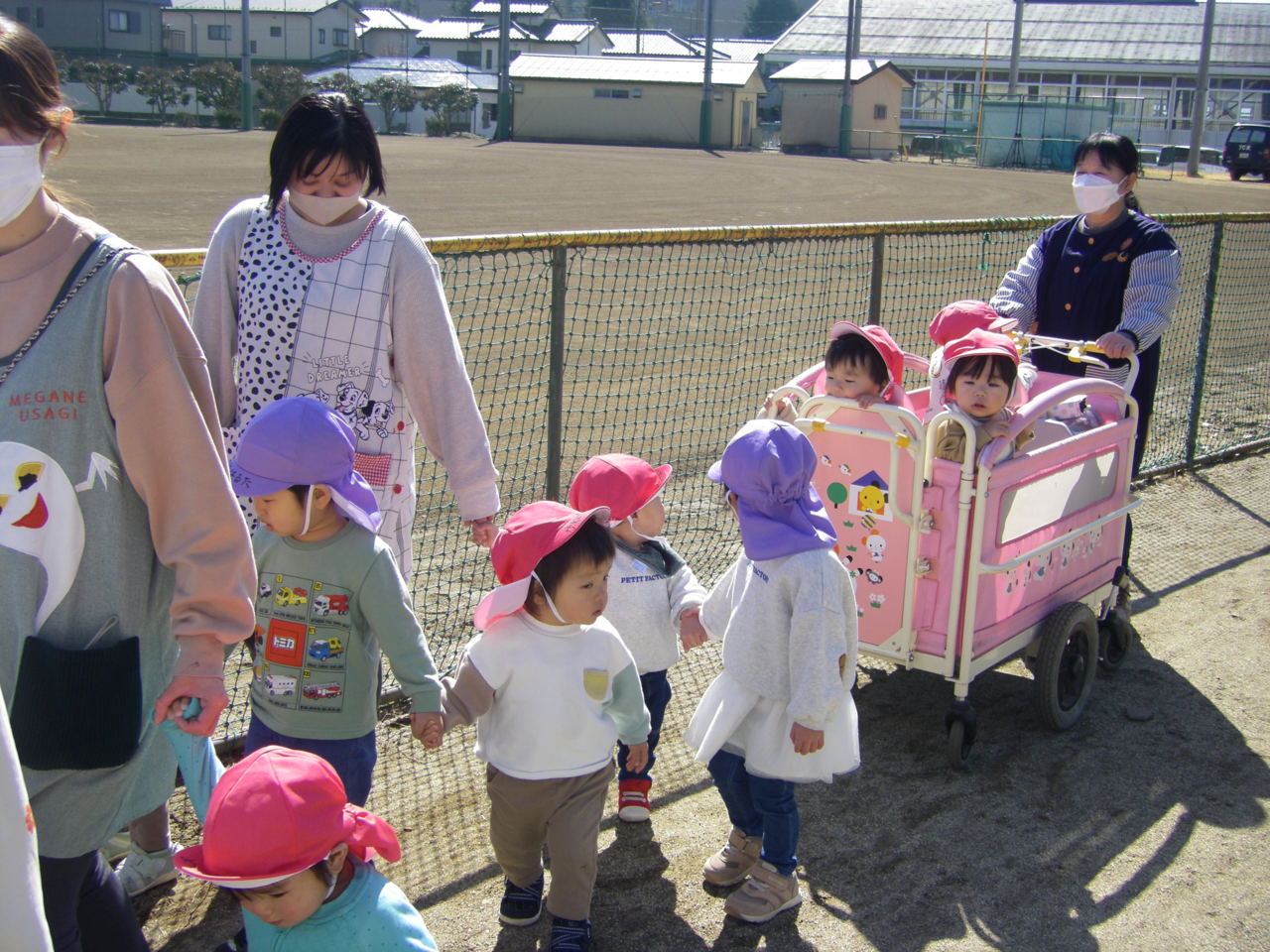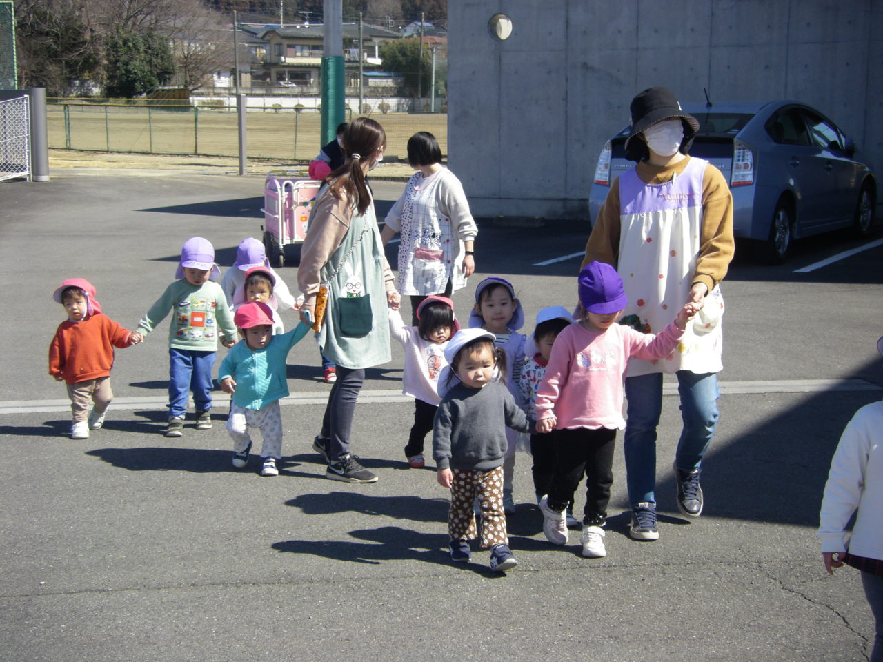 春の日差しが温かい日、りず、こあら、ぱんだ組みんなで、園周辺にお散歩に出かけました。