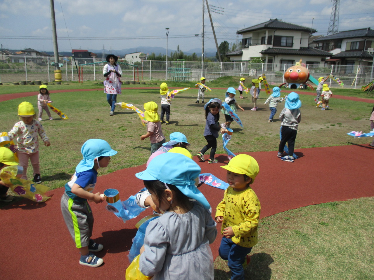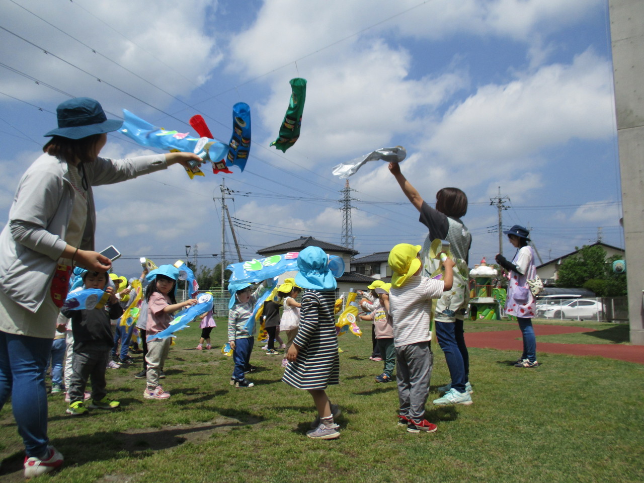 爽やかな5月の空の下で、先生や友達と一緒に体操をしたり自分で作ったこいのぼりで遊びました。
