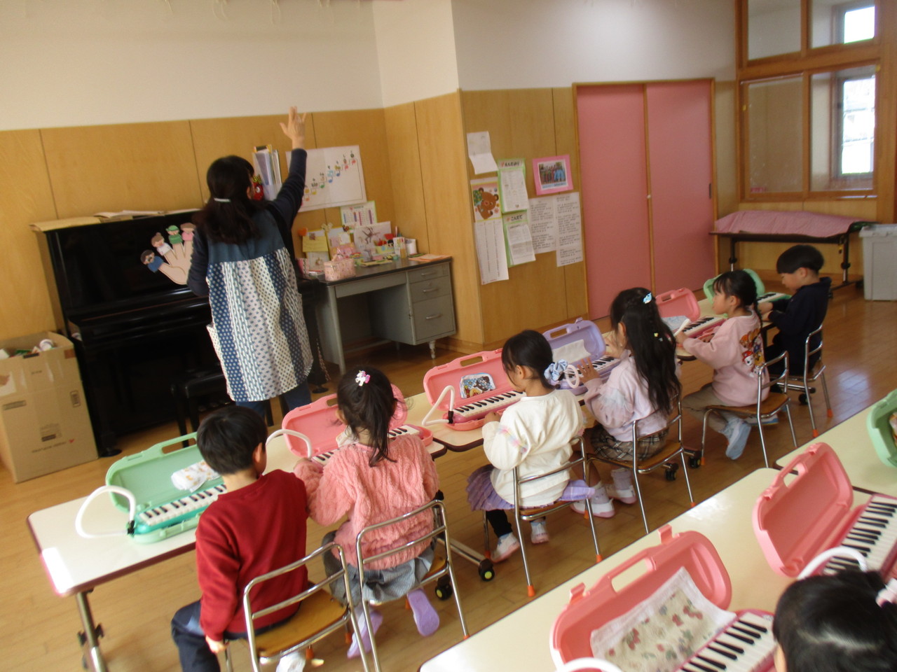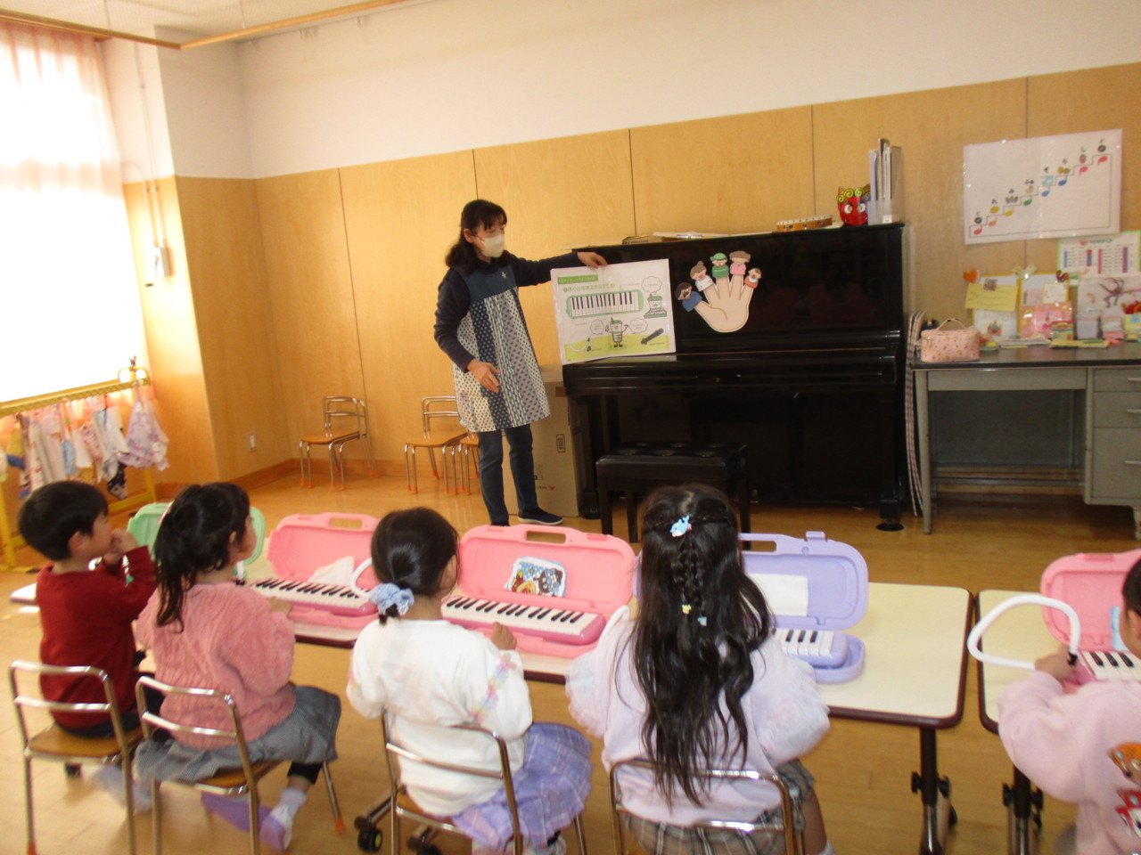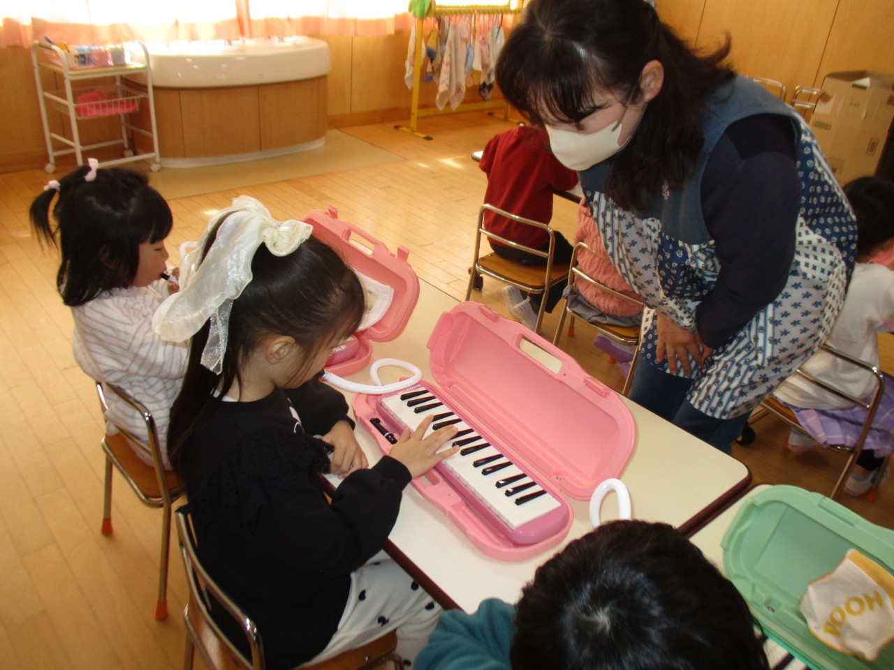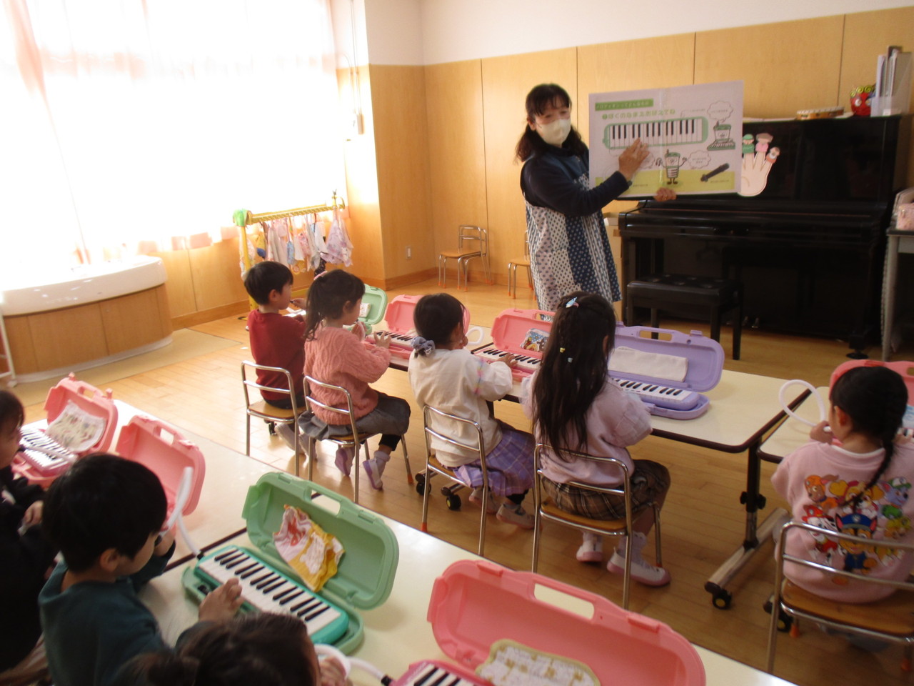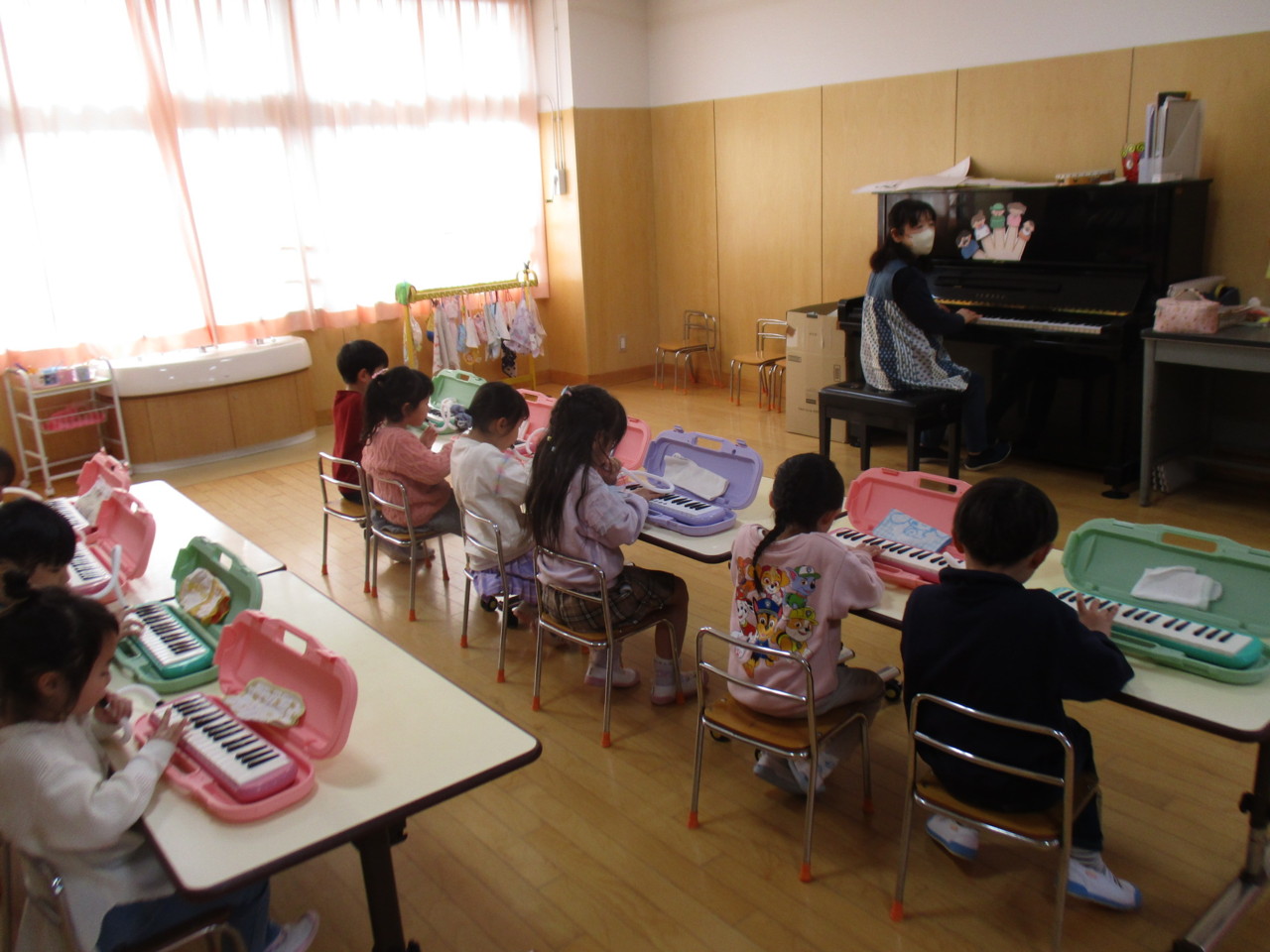 うさぎ組のリトミックでメロディオンが始まりました。
